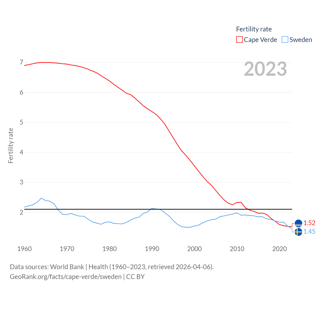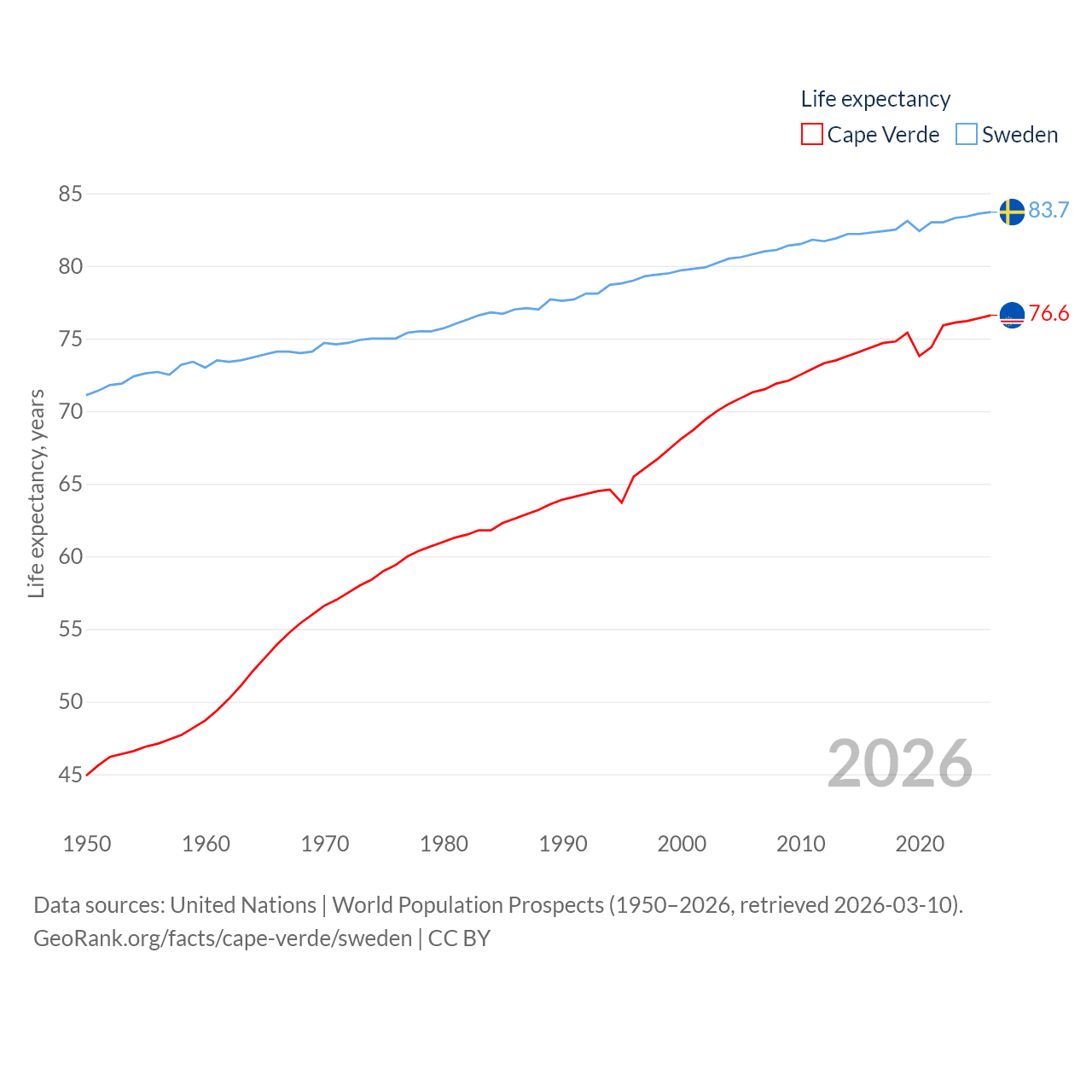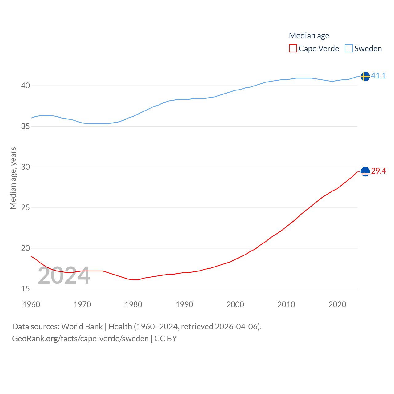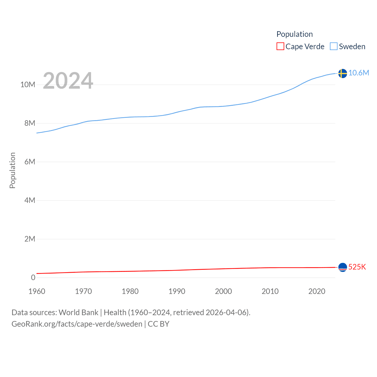 Cape Verde has a population of 525K (ranked 169/197), compared with 10.6M in Sweden (ranked 93/197). Cape Verde's land area is 1,556 sq mi versus 157,248 sq mi for Sweden (ranked 167th vs. 58th).