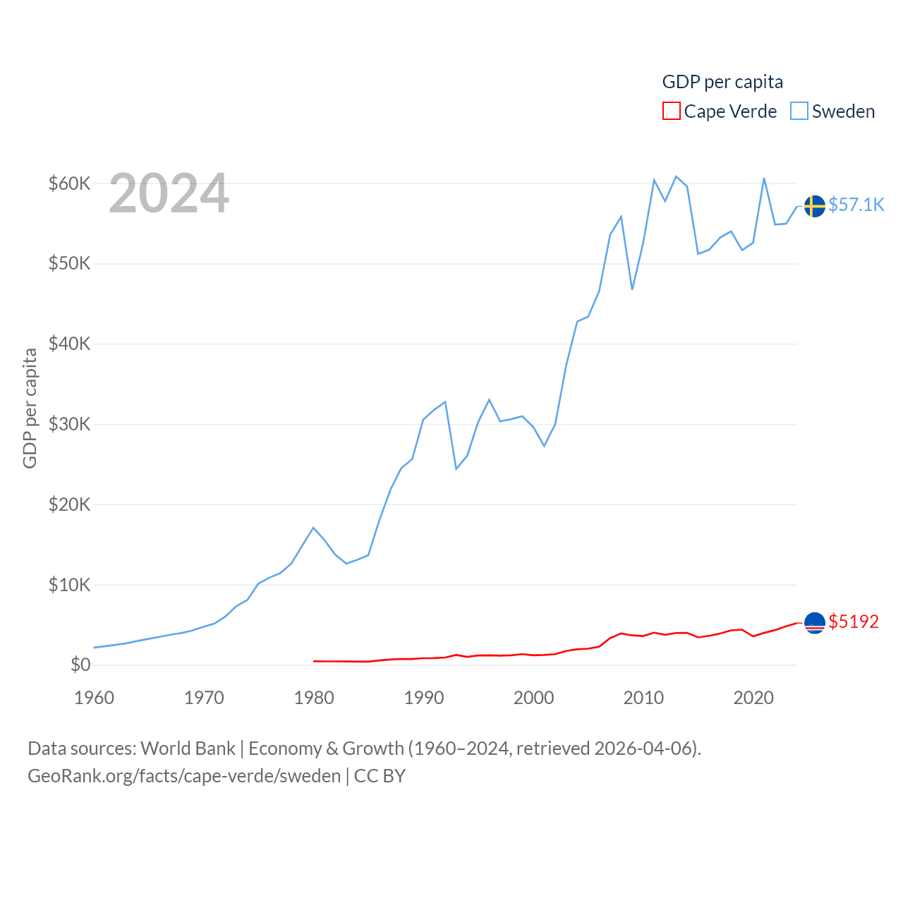 By GDP, Cape Verde ranks 172/197 ($2.73B) and Sweden ranks 26/197 ($604B). By GDP per capita, Cape Verde ranks 118/197 ($5,192), while Sweden ranks 17/197 ($57,117).