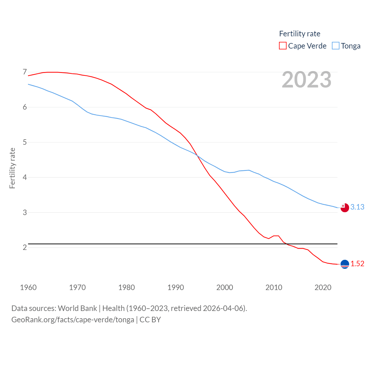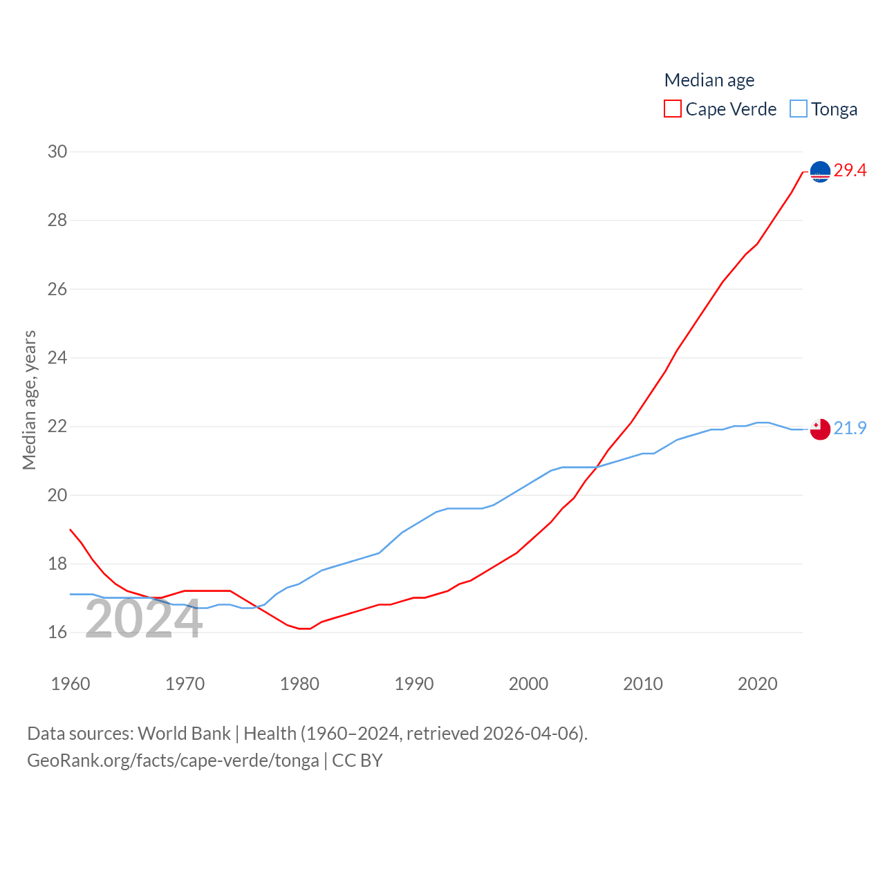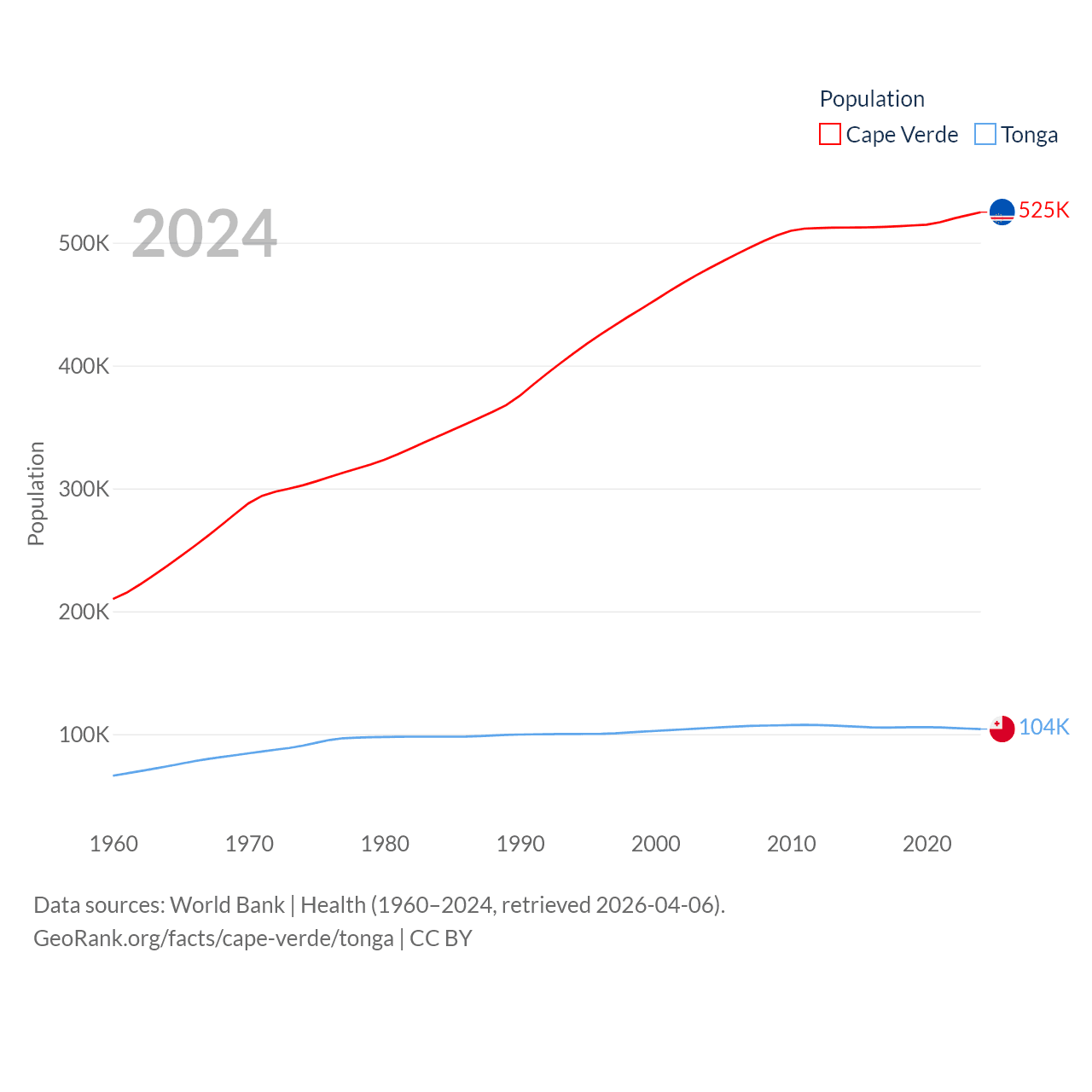 Cape Verde has a population of 525K (ranked 169/197), compared with 104K in Tonga (ranked 183/197). Cape Verde's land area is 1,556 sq mi versus 278 sq mi for Tonga (ranked 167th vs. 176th).