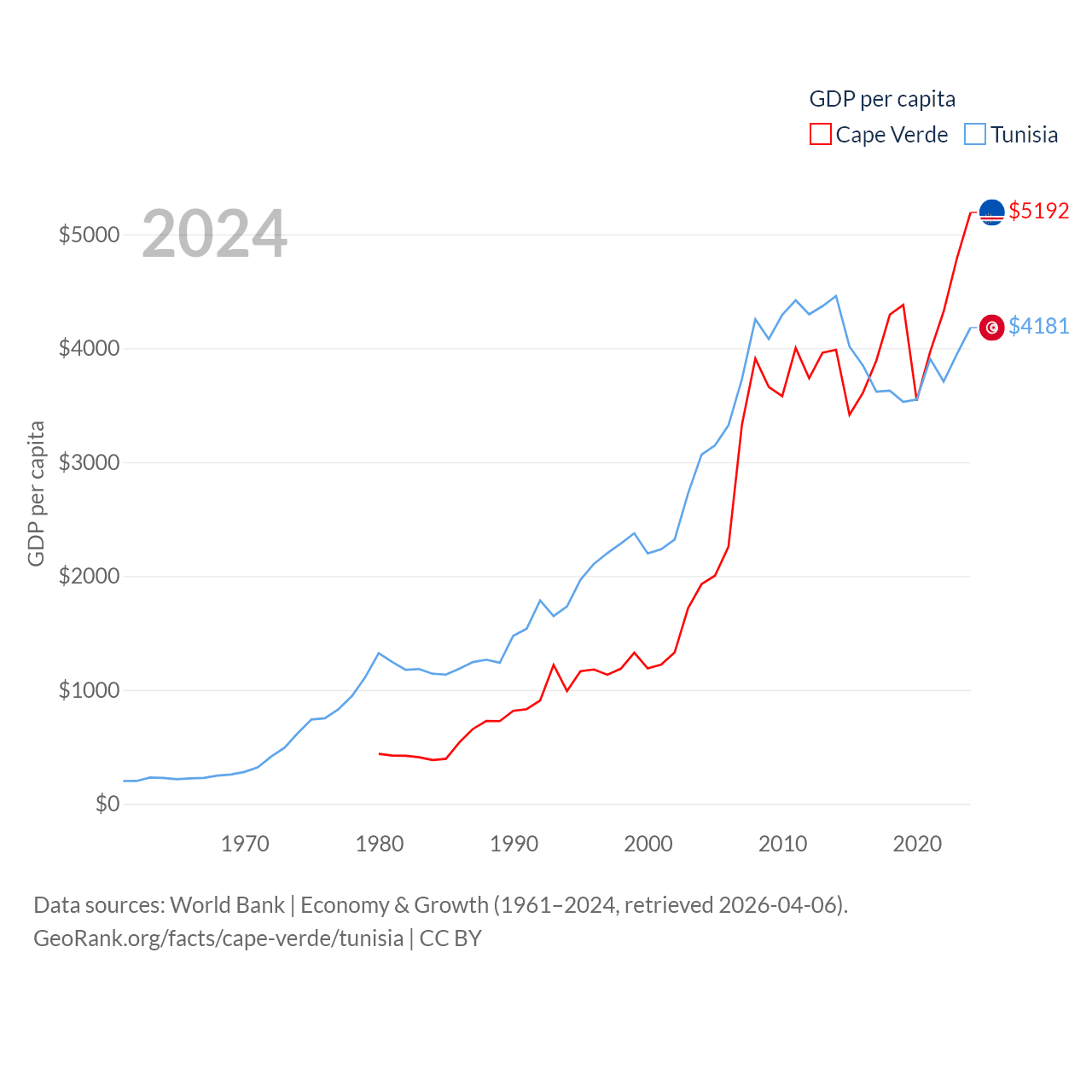 By GDP, Cape Verde ranks 172/197 ($2.73B) and Tunisia ranks 93/197 ($51.3B). By GDP per capita, Cape Verde ranks 118/197 ($5,192), while Tunisia ranks 129/197 ($4,181).