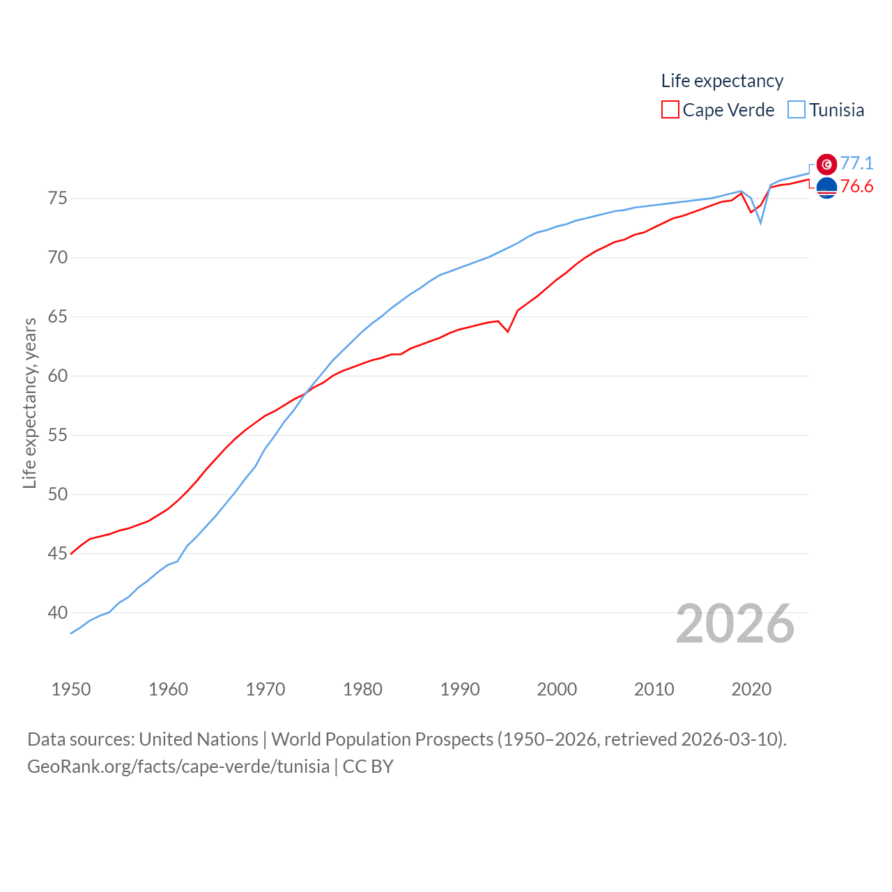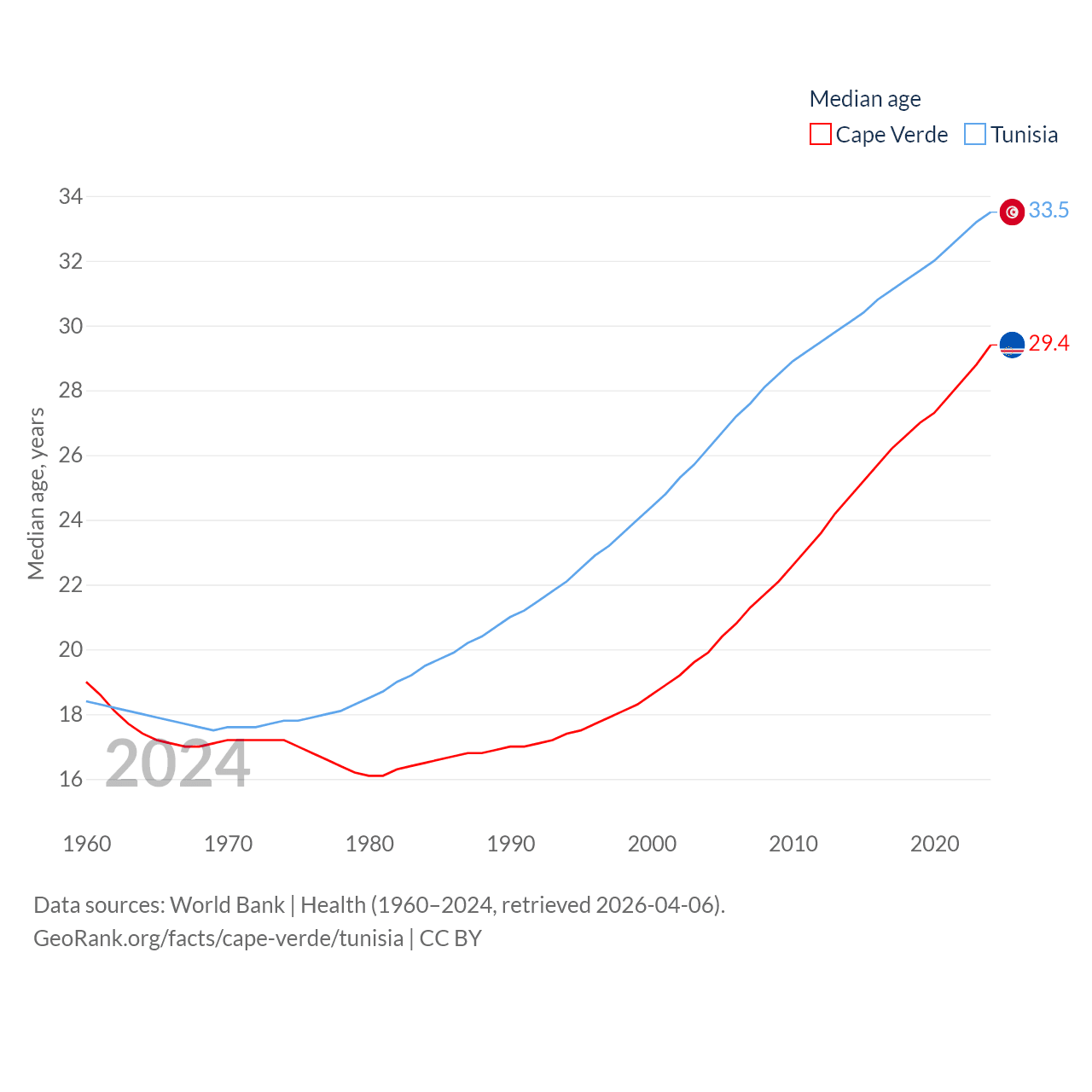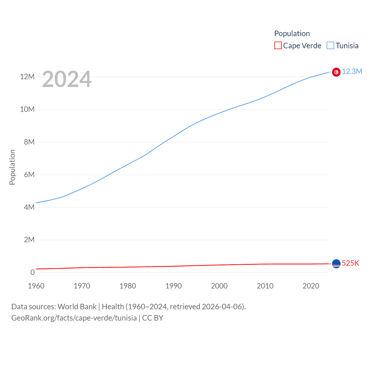 Cape Verde has a population of 525K (ranked 169/197), compared with 12.3M in Tunisia (ranked 80/197). Cape Verde's land area is 1,556 sq mi versus 59,985 sq mi for Tunisia (ranked 167th vs. 91st).