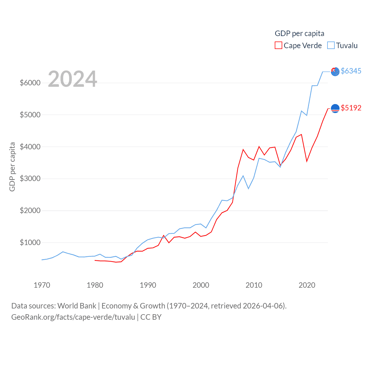 By GDP, Cape Verde ranks 172/197 ($2.73B) and Tuvalu ranks 196/197 ($62.3M). By GDP per capita, Cape Verde ranks 118/197 ($5,192), while Tuvalu ranks 110/197 ($6,345).