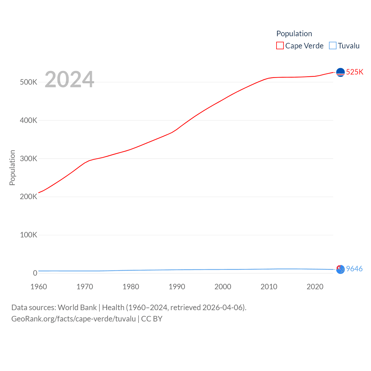 Cape Verde has a population of 525K (ranked 169/197), compared with 9.65K in Tuvalu (ranked 196/197). Cape Verde's land area is 1,556 sq mi versus 11.6 sq mi for Tuvalu (ranked 167th vs. 194th).