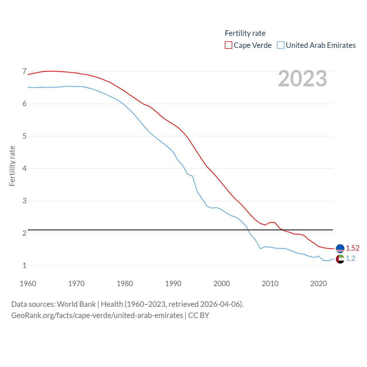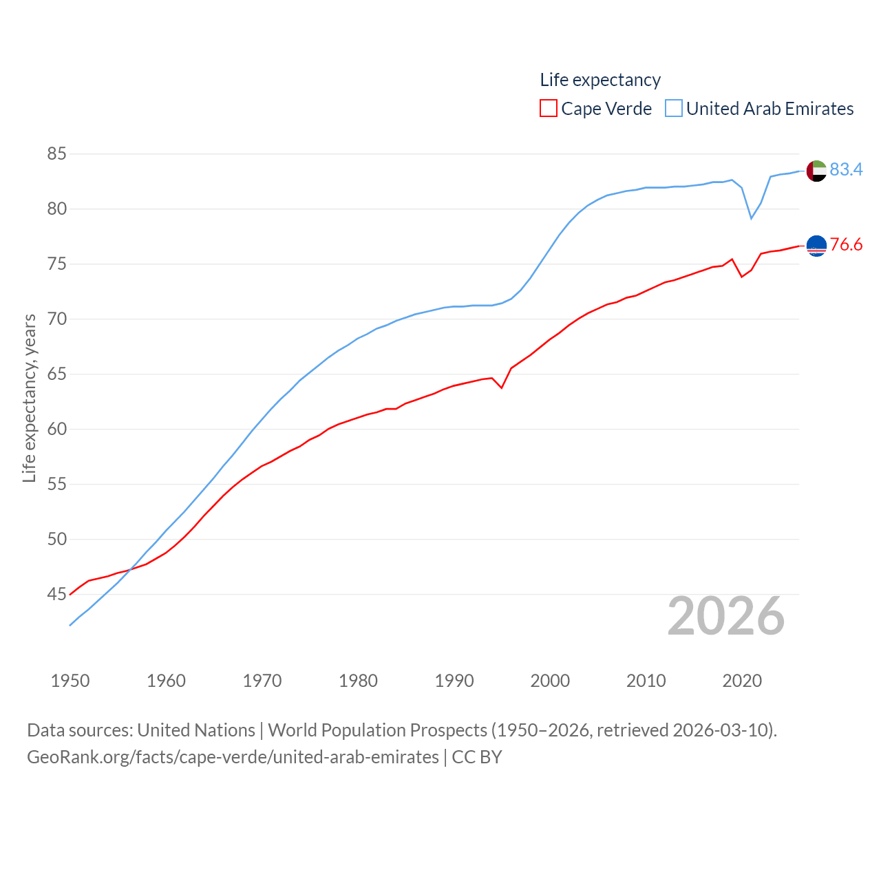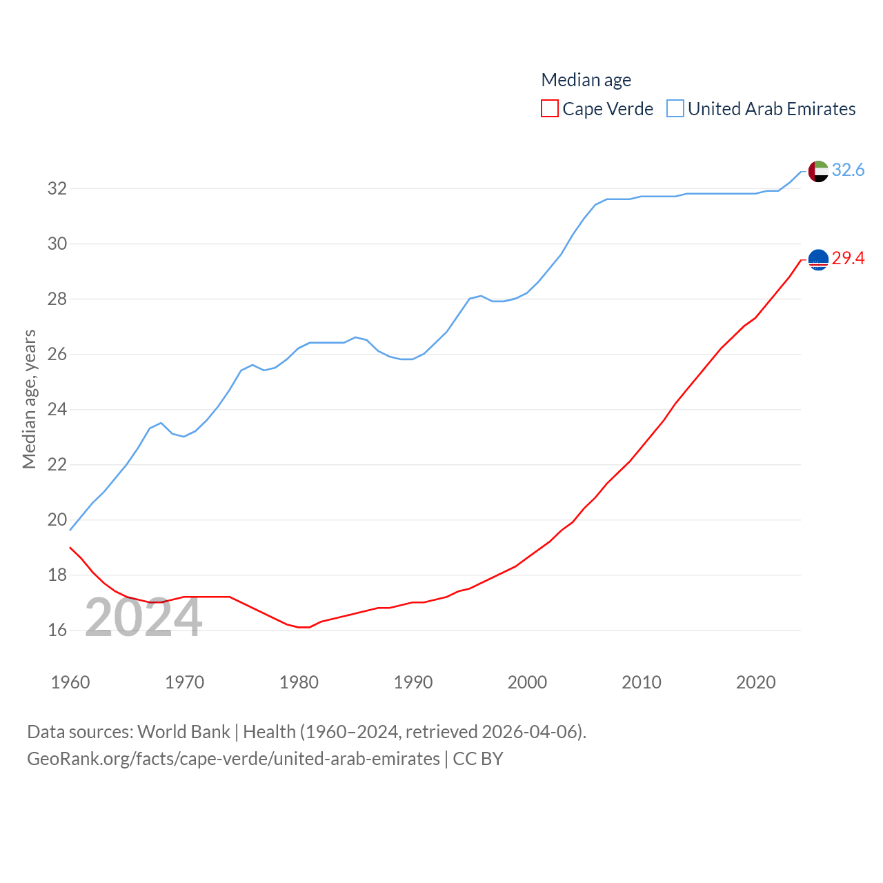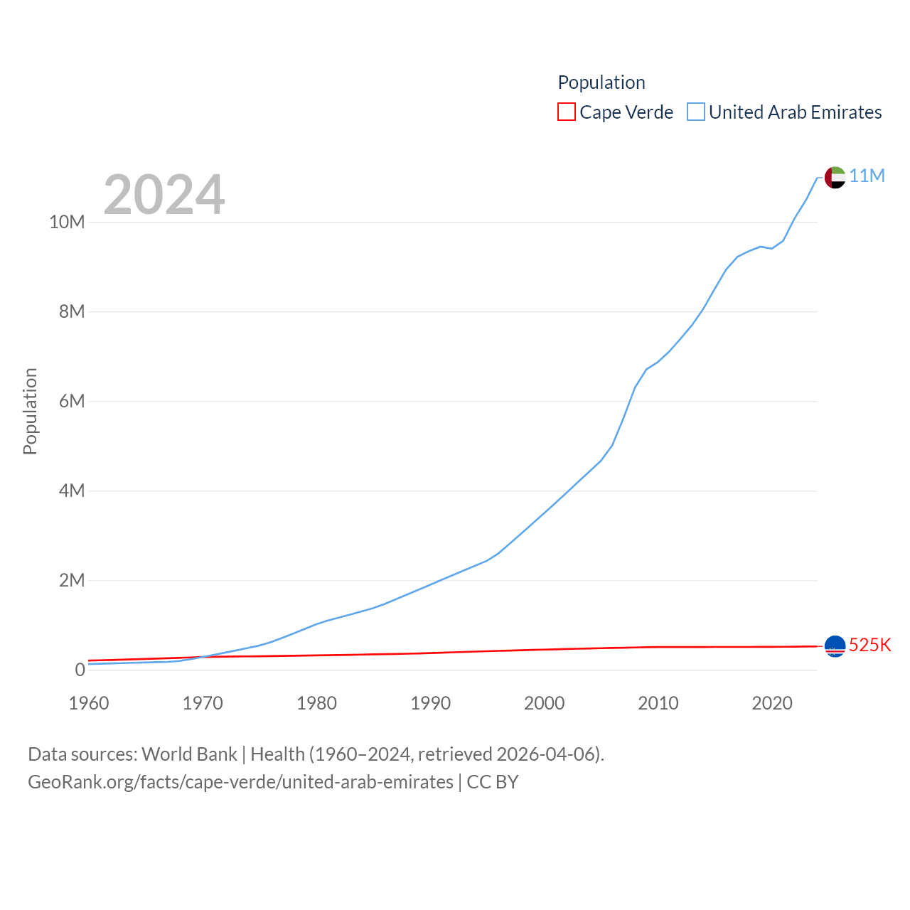 Cape Verde has a population of 525K (ranked 169/197), compared with 11M in The United Arab Emirates (ranked 86/197). Cape Verde's land area is 1,556 sq mi versus 27,421 sq mi for The United Arab Emirates (ranked 167th vs. 117th).
