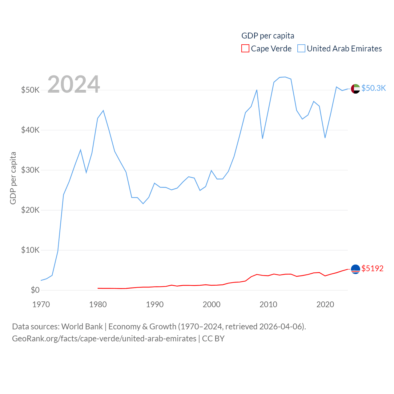By GDP, Cape Verde ranks 172/197 ($2.73B) and The United Arab Emirates ranks 27/197 ($552B). By GDP per capita, Cape Verde ranks 118/197 ($5,192), while The United Arab Emirates ranks 24/197 ($50,274).