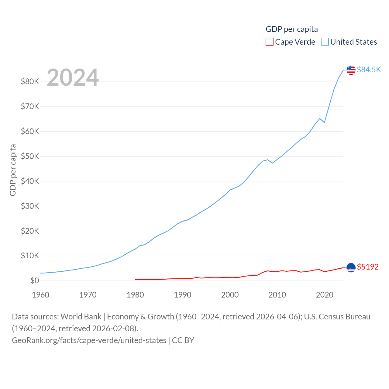 By GDP, Cape Verde ranks 172/197 ($2.73B) and The United States ranks 1/197 ($28.8T). By GDP per capita, Cape Verde ranks 118/197 ($5,192), while The United States ranks 10/197 ($84,534).
