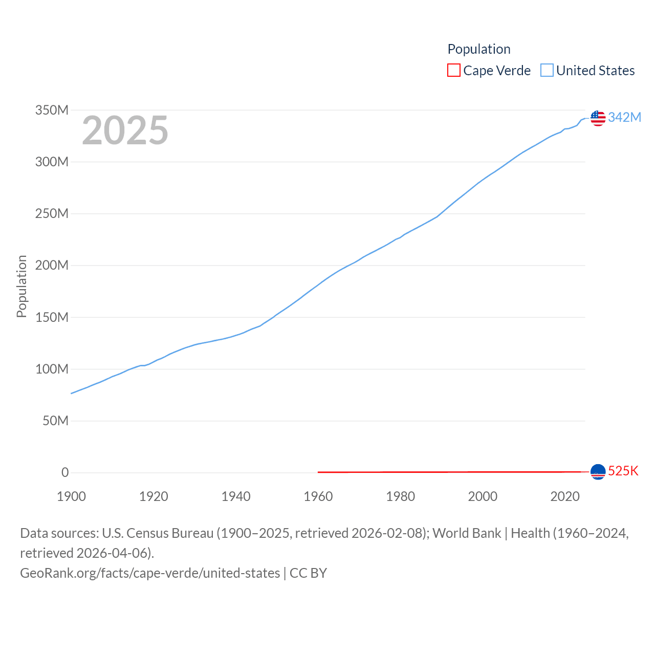Cape Verde has a population of 525K (ranked 169/197), compared with 342M in The United States (ranked 3/197). Cape Verde's land area is 1,556 sq mi versus 3,531,839 sq mi for The United States (ranked 167th vs. 3rd).