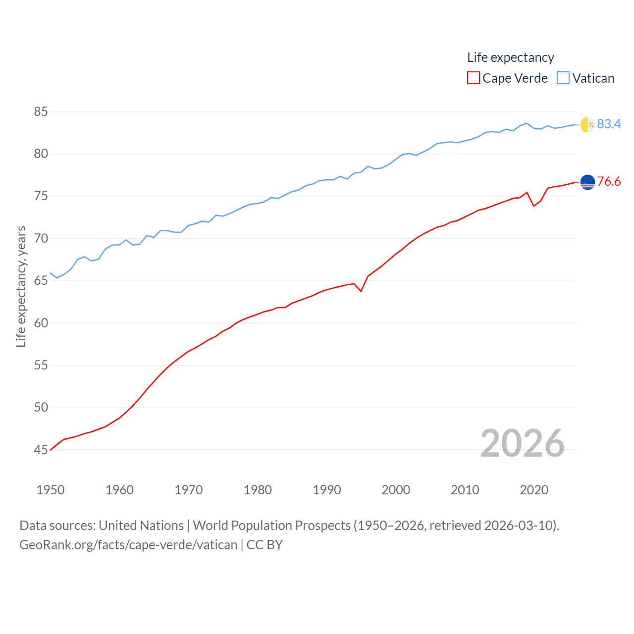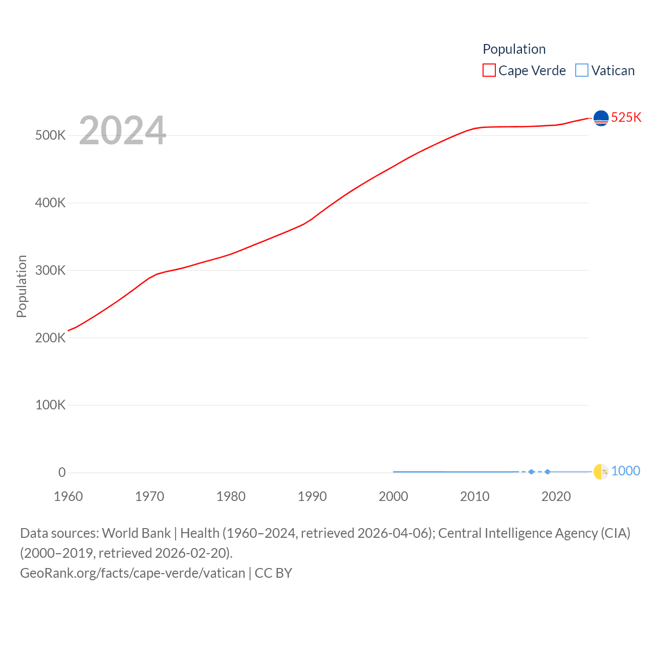 Cape Verde has a population of 525K (ranked 169/197), compared with 1K in The Vatican (ranked 197/197). Cape Verde's land area is 1,556 sq mi versus 0.17 sq mi for The Vatican (ranked 167th vs. 197th).