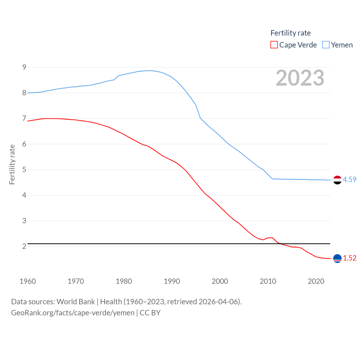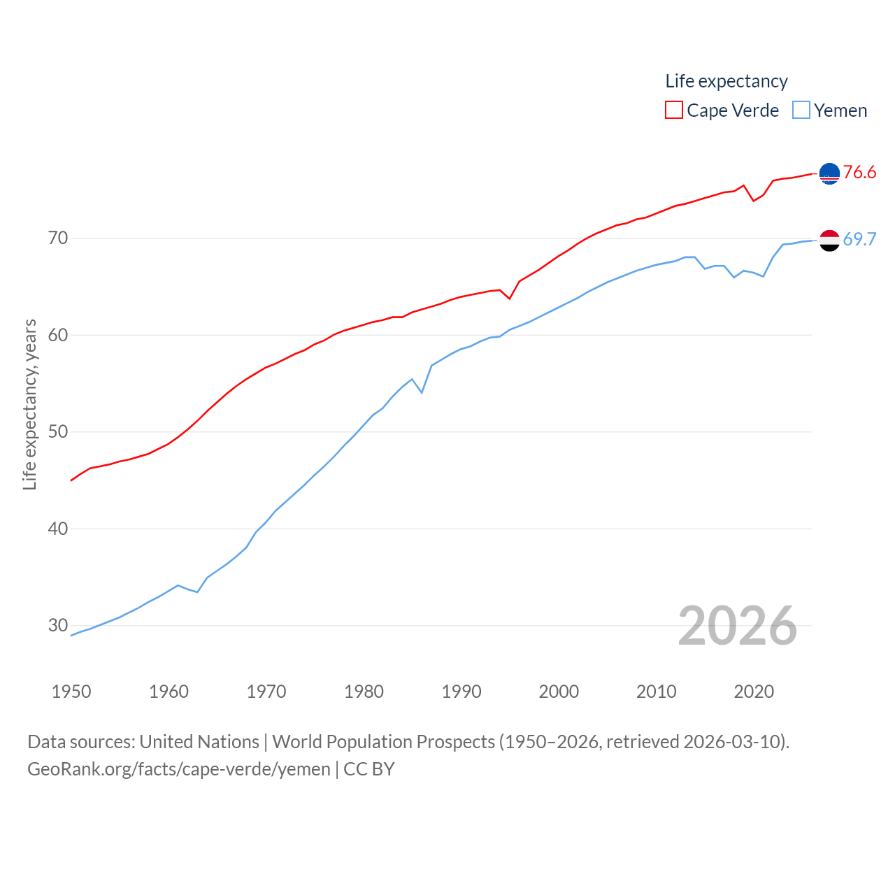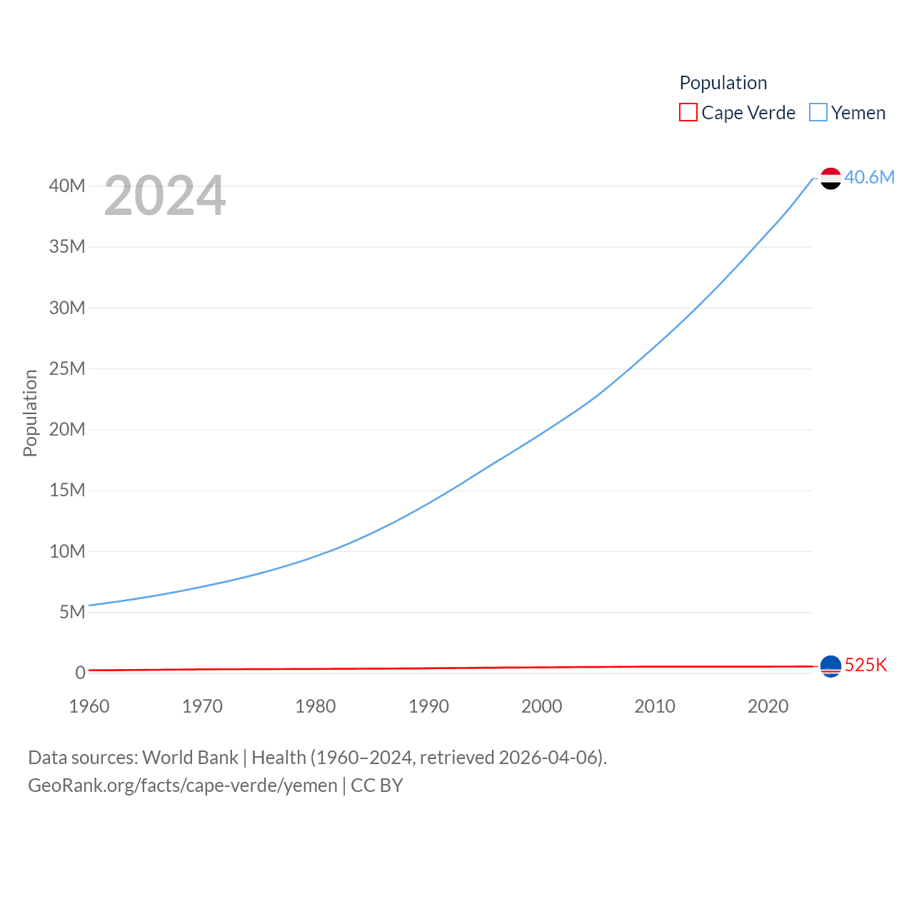 Cape Verde has a population of 525K (ranked 169/197), compared with 40.6M in Yemen (ranked 38/197). Cape Verde's land area is 1,556 sq mi versus 203,850 sq mi for Yemen (ranked 167th vs. 49th).