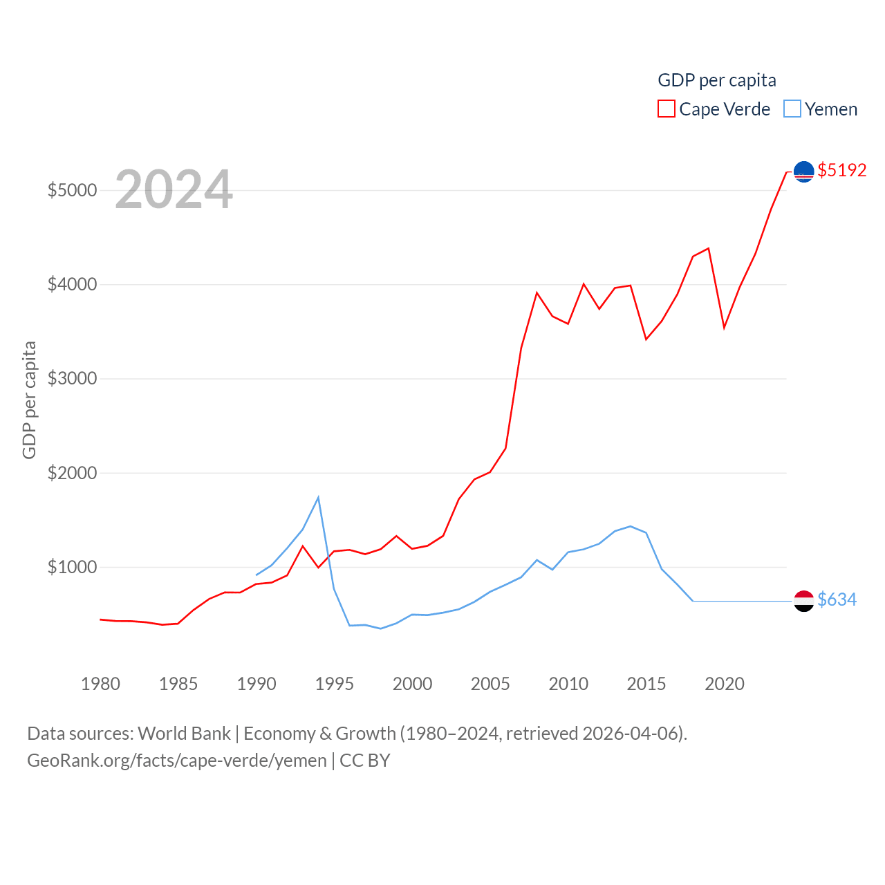 By GDP, Cape Verde ranks 172/197 ($2.73B) and Yemen ranks 125/197 ($21.6B). By GDP per capita, Cape Verde ranks 118/197 ($5,192), while Yemen ranks 191/197 ($634).