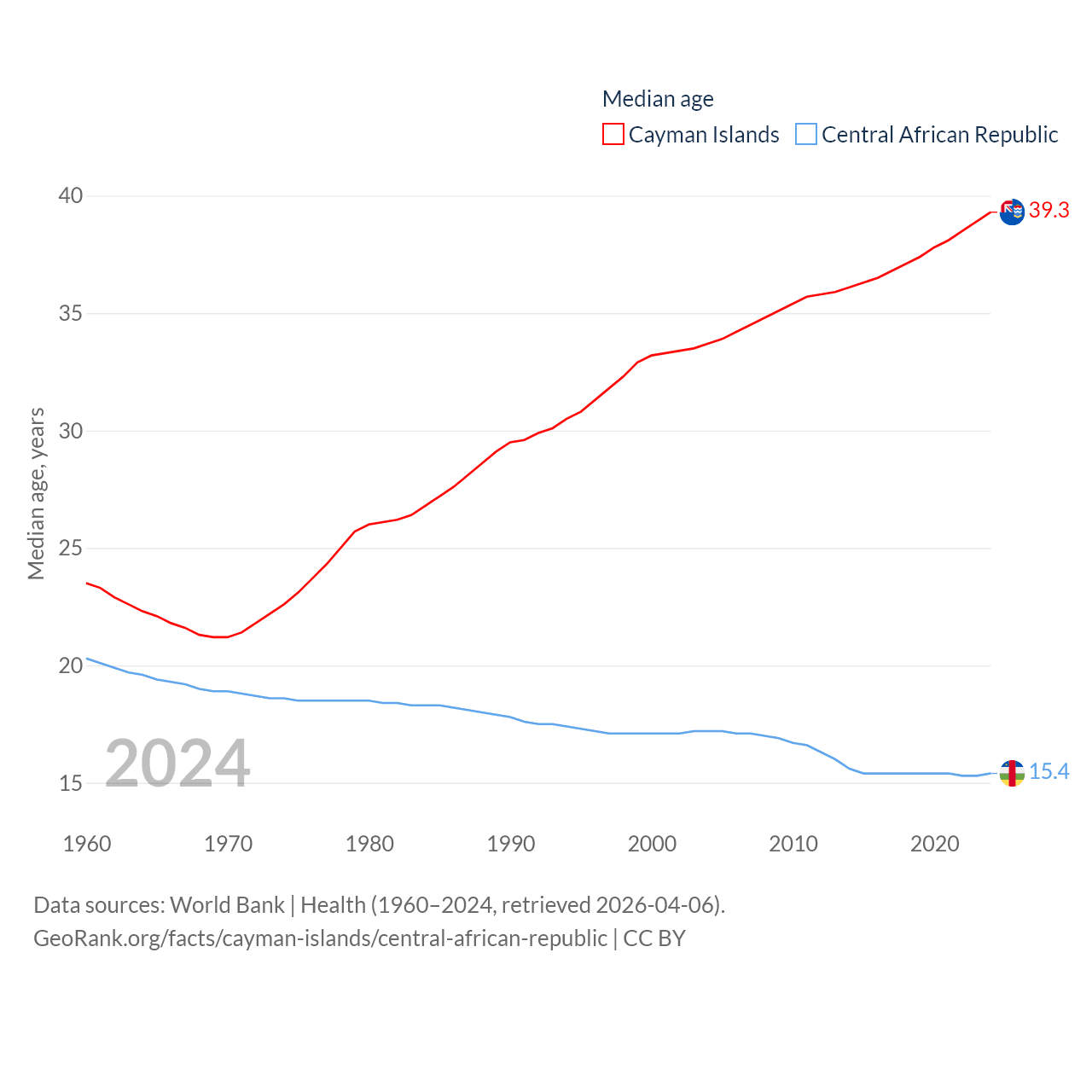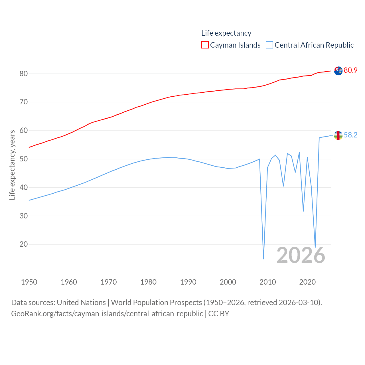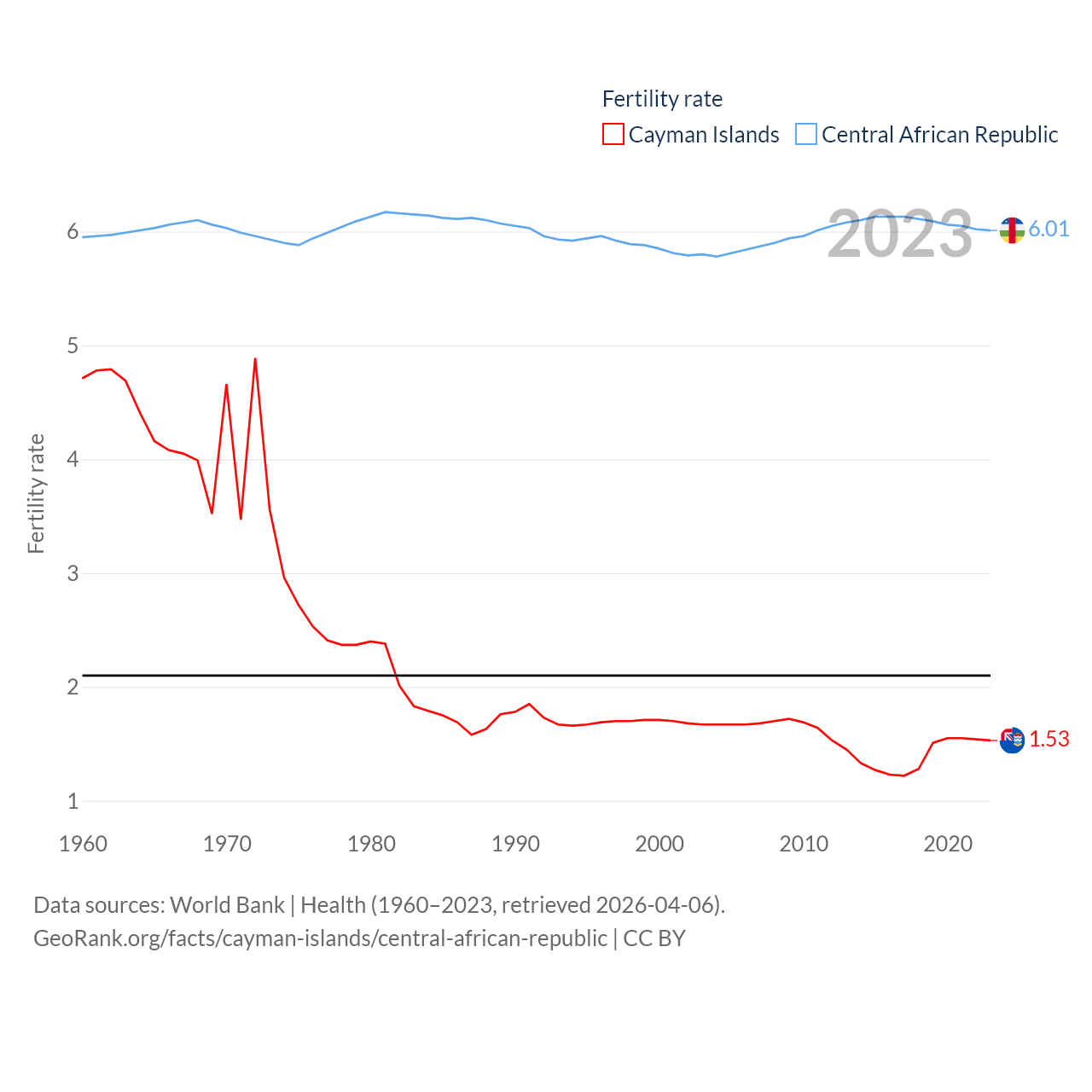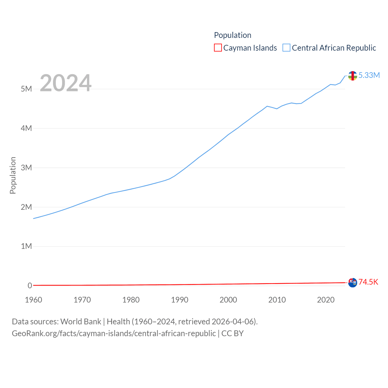 The Cayman Islands has a population of 74.5K (ranked 187/197), compared with 5.33M in The Central African Republic (ranked 121/197). The Cayman Islands' land area is 92.7 sq mi versus 240,534 sq mi for The Central African Republic (ranked 190th vs. 43rd).