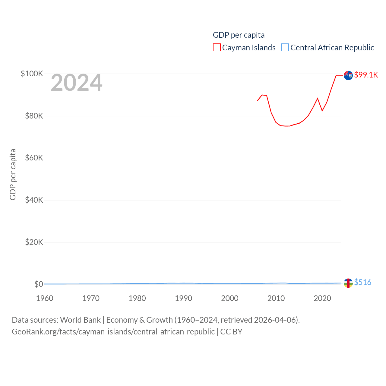By GDP, The Cayman Islands ranks 158/197 ($7.24B) and The Central African Republic ranks 171/197 ($2.75B). By GDP per capita, The Cayman Islands ranks 6/197 ($99,144), while The Central African Republic ranks 195/197 ($516).