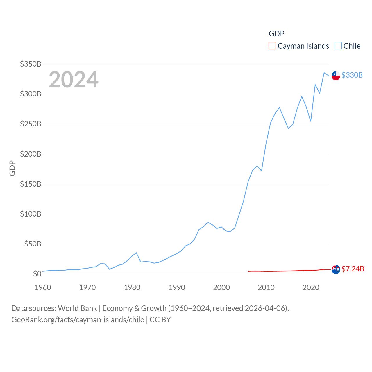 By GDP, The Cayman Islands ranks 158/197 ($7.24B) and Chile ranks 45/197 ($330B). By GDP per capita, The Cayman Islands ranks 6/197 ($99,144), while Chile ranks 65/197 ($16,710).
