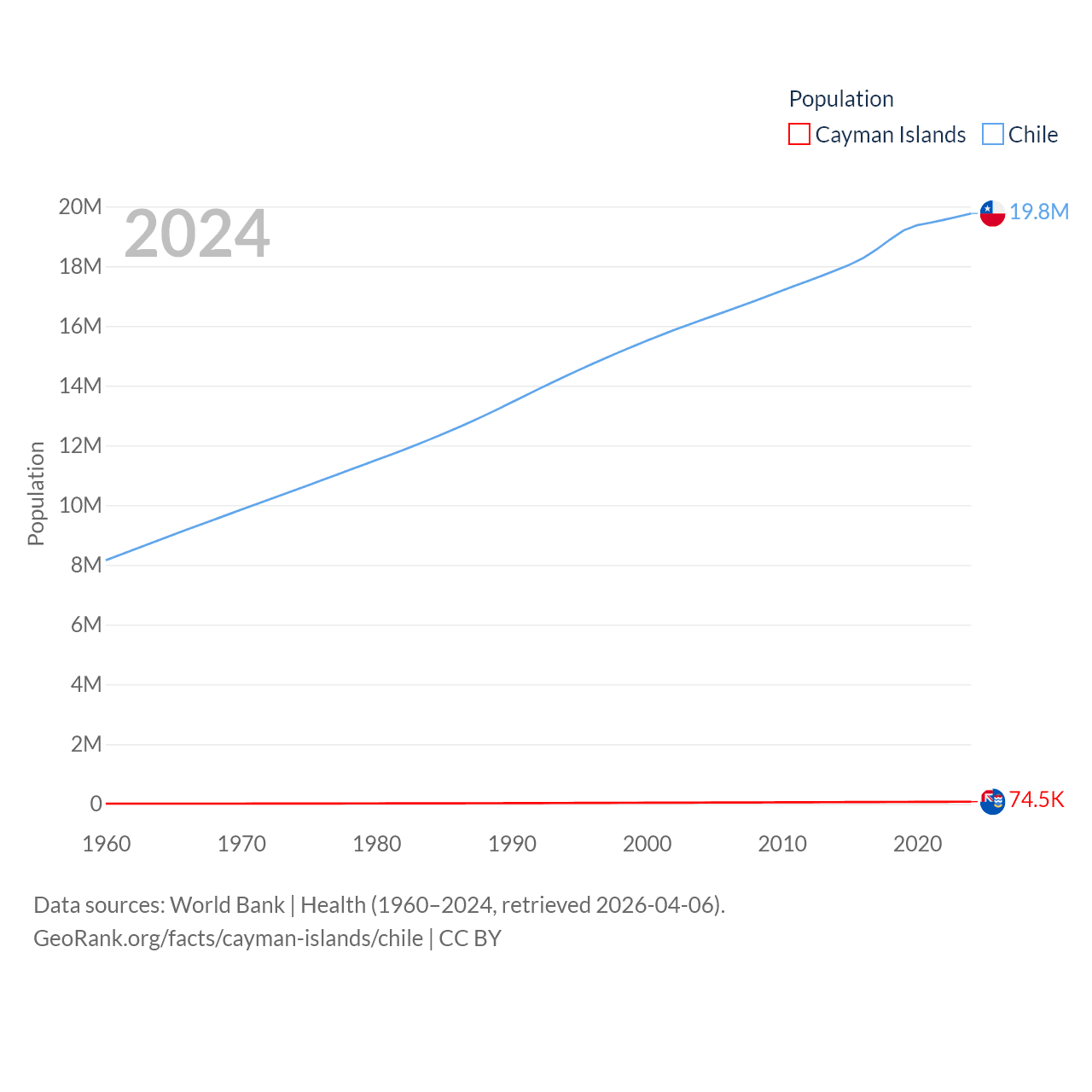 The Cayman Islands has a population of 74.5K (ranked 187/197), compared with 19.8M in Chile (ranked 66/197). The Cayman Islands' land area is 92.7 sq mi versus 286,809 sq mi for Chile (ranked 190th vs. 38th).