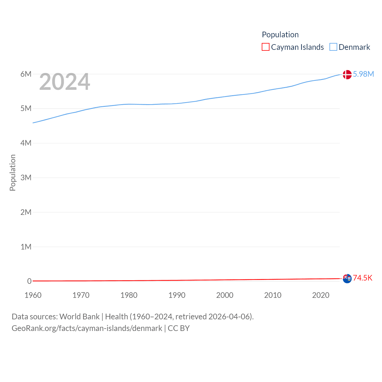 The Cayman Islands has a population of 74.5K (ranked 187/197), compared with 5.98M in Denmark (ranked 114/197). The Cayman Islands' land area is 92.7 sq mi versus 15,444 sq mi for Denmark (ranked 190th vs. 130th).