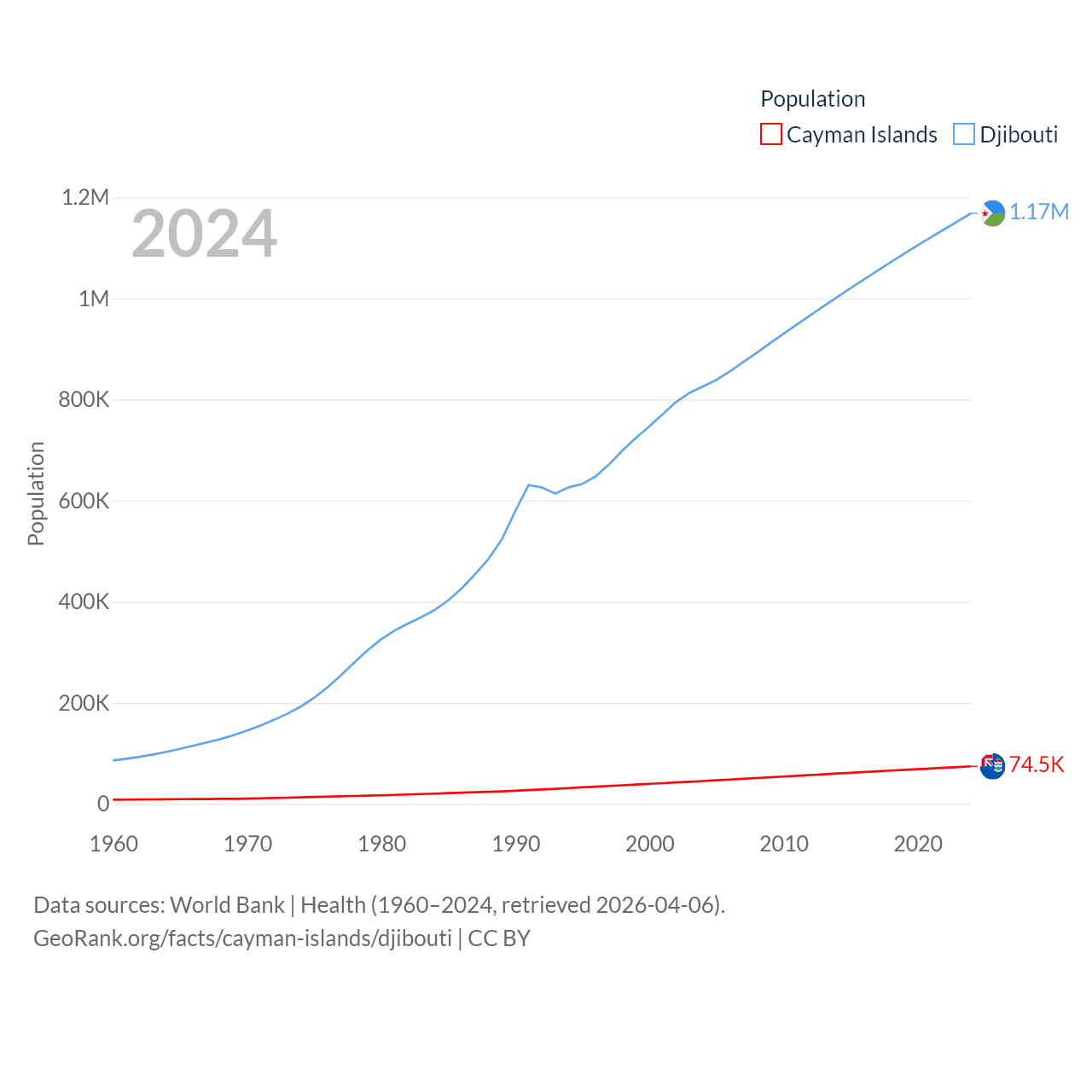 The Cayman Islands has a population of 74.5K (ranked 187/197), compared with 1.17M in Djibouti (ranked 158/197). The Cayman Islands' land area is 92.7 sq mi versus 8,950 sq mi for Djibouti (ranked 190th vs. 147th).
