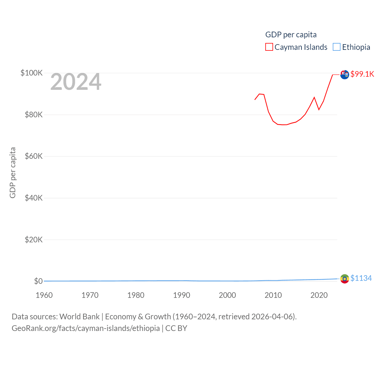 By GDP, The Cayman Islands ranks 158/197 ($7.24B) and Ethiopia ranks 60/197 ($150B). By GDP per capita, The Cayman Islands ranks 6/197 ($99,144), while Ethiopia ranks 171/197 ($1,134).