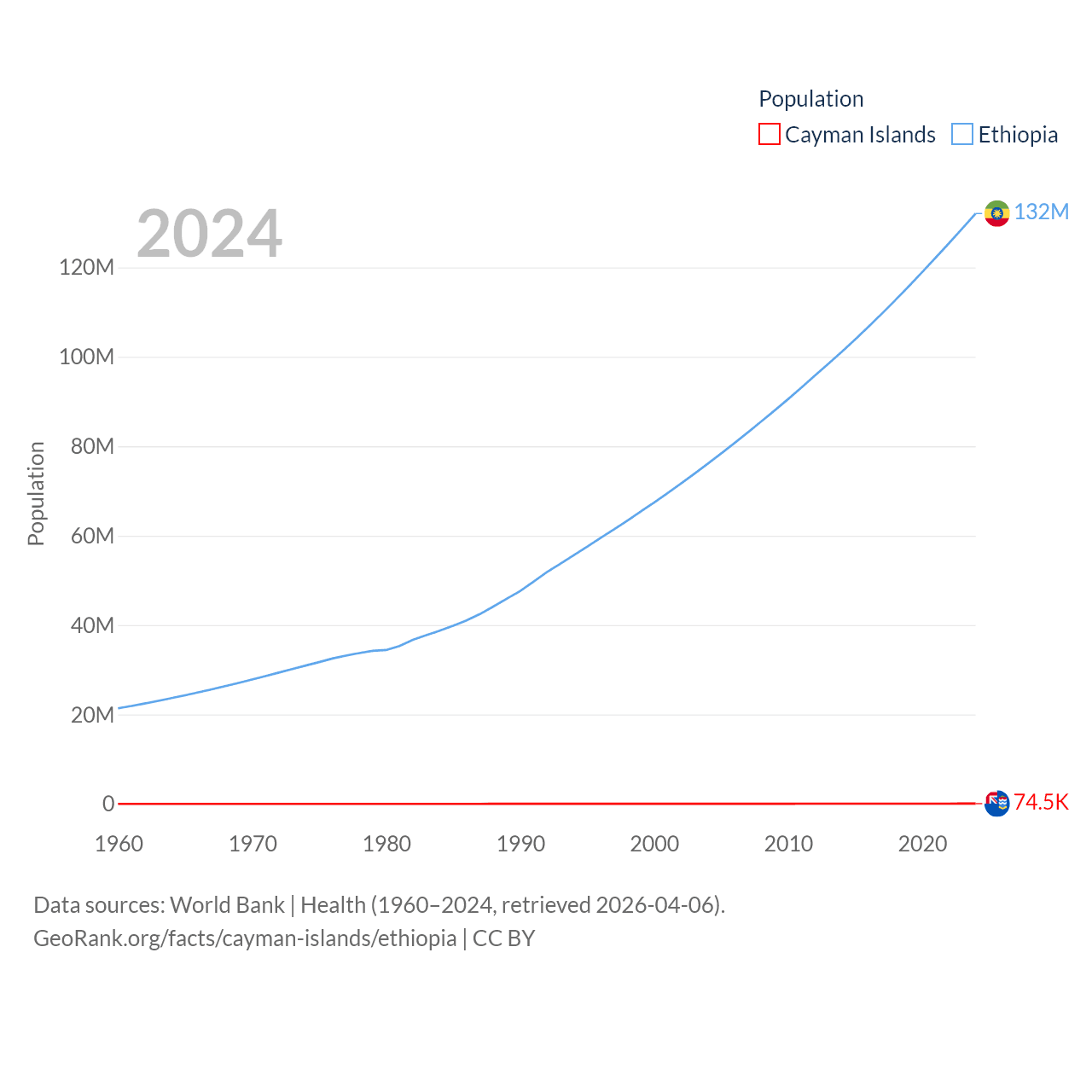 The Cayman Islands has a population of 74.5K (ranked 187/197), compared with 132M in Ethiopia (ranked 10/197). The Cayman Islands' land area is 92.7 sq mi versus 435,716 sq mi for Ethiopia (ranked 190th vs. 25th).