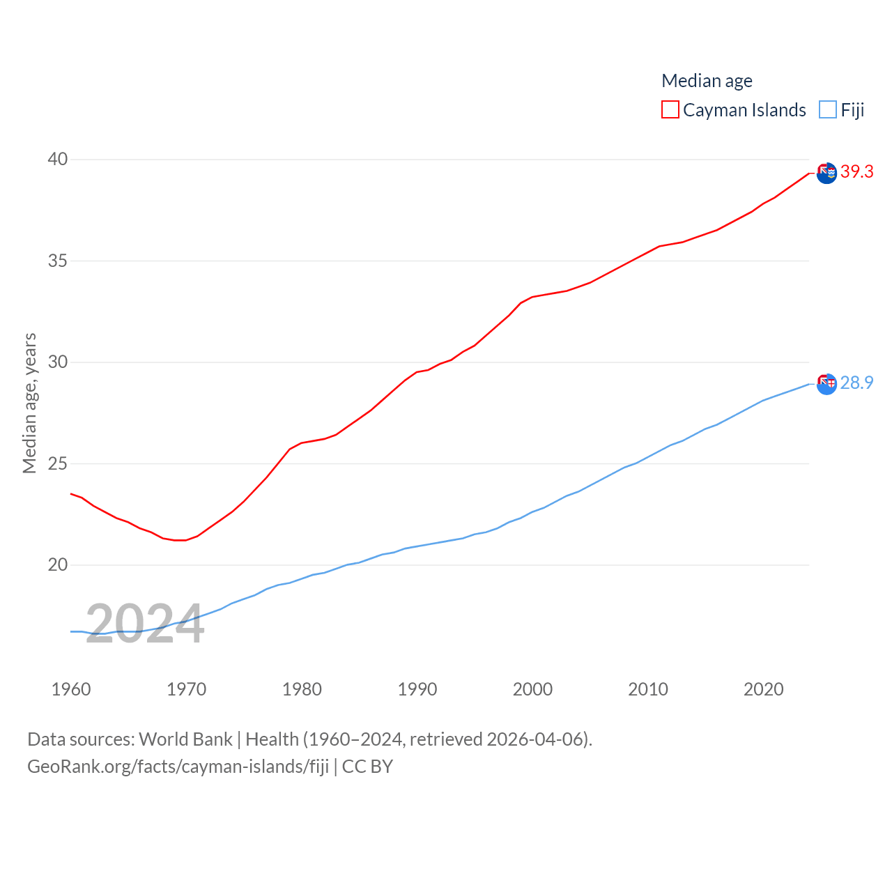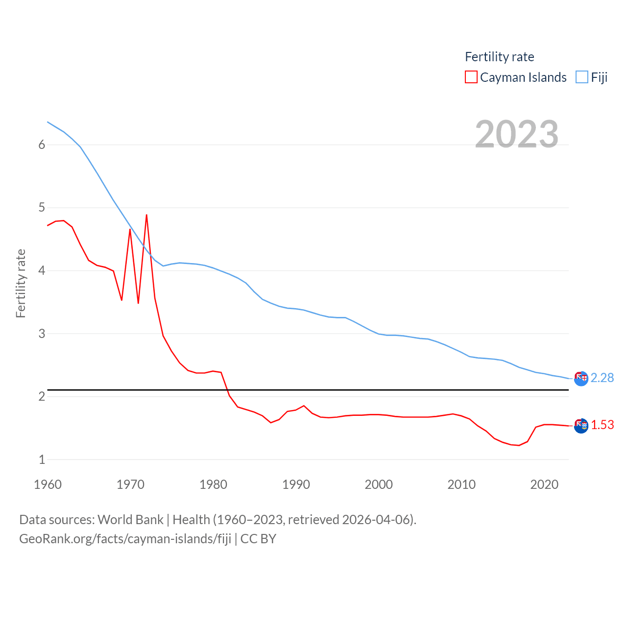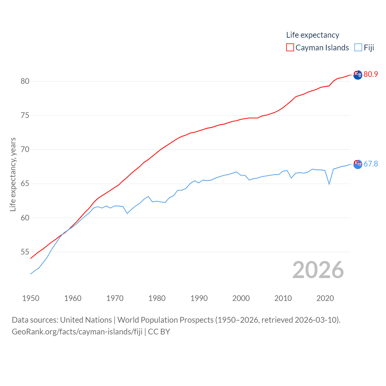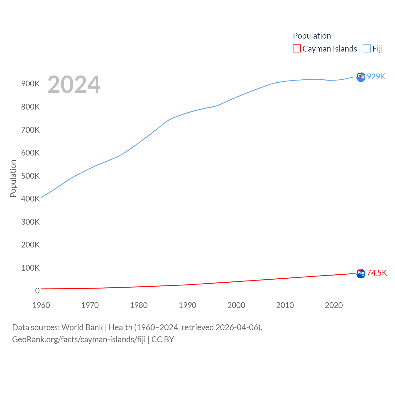 The Cayman Islands has a population of 74.5K (ranked 187/197), compared with 929K in Fiji (ranked 159/197). The Cayman Islands' land area is 92.7 sq mi versus 7,054 sq mi for Fiji (ranked 190th vs. 152nd).