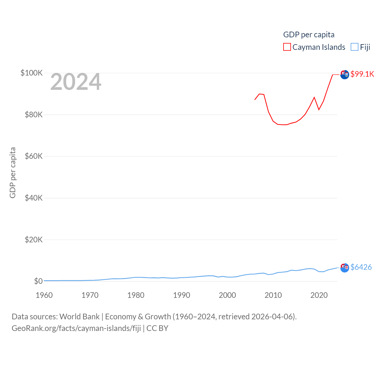 By GDP, The Cayman Islands ranks 158/197 ($7.24B) and Fiji ranks 161/197 ($5.97B). By GDP per capita, The Cayman Islands ranks 6/197 ($99,144), while Fiji ranks 108/197 ($6,426).