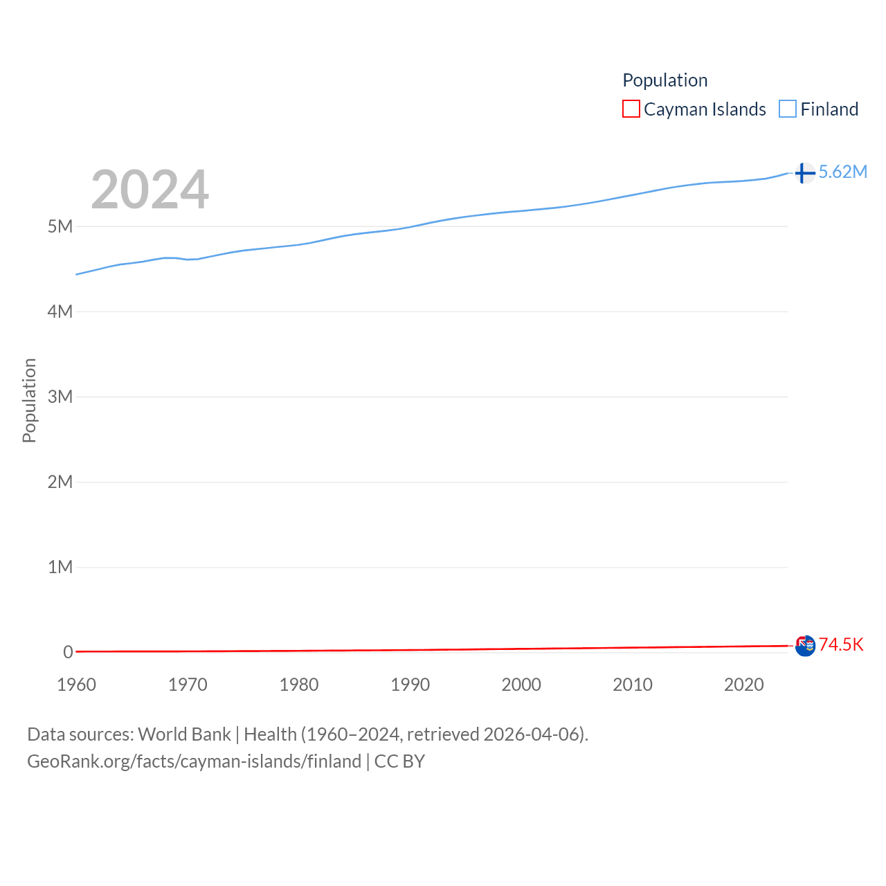 The Cayman Islands has a population of 74.5K (ranked 187/197), compared with 5.62M in Finland (ranked 116/197). The Cayman Islands' land area is 92.7 sq mi versus 117,360 sq mi for Finland (ranked 190th vs. 70th).