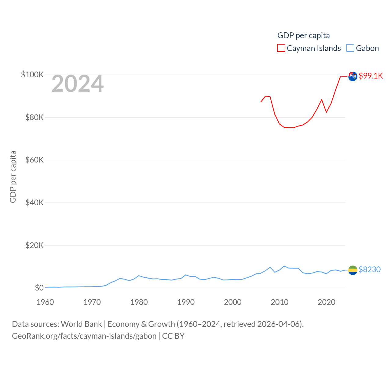 By GDP, The Cayman Islands ranks 158/197 ($7.24B) and Gabon ranks 127/197 ($20.9B). By GDP per capita, The Cayman Islands ranks 6/197 ($99,144), while Gabon ranks 93/197 ($8,230).