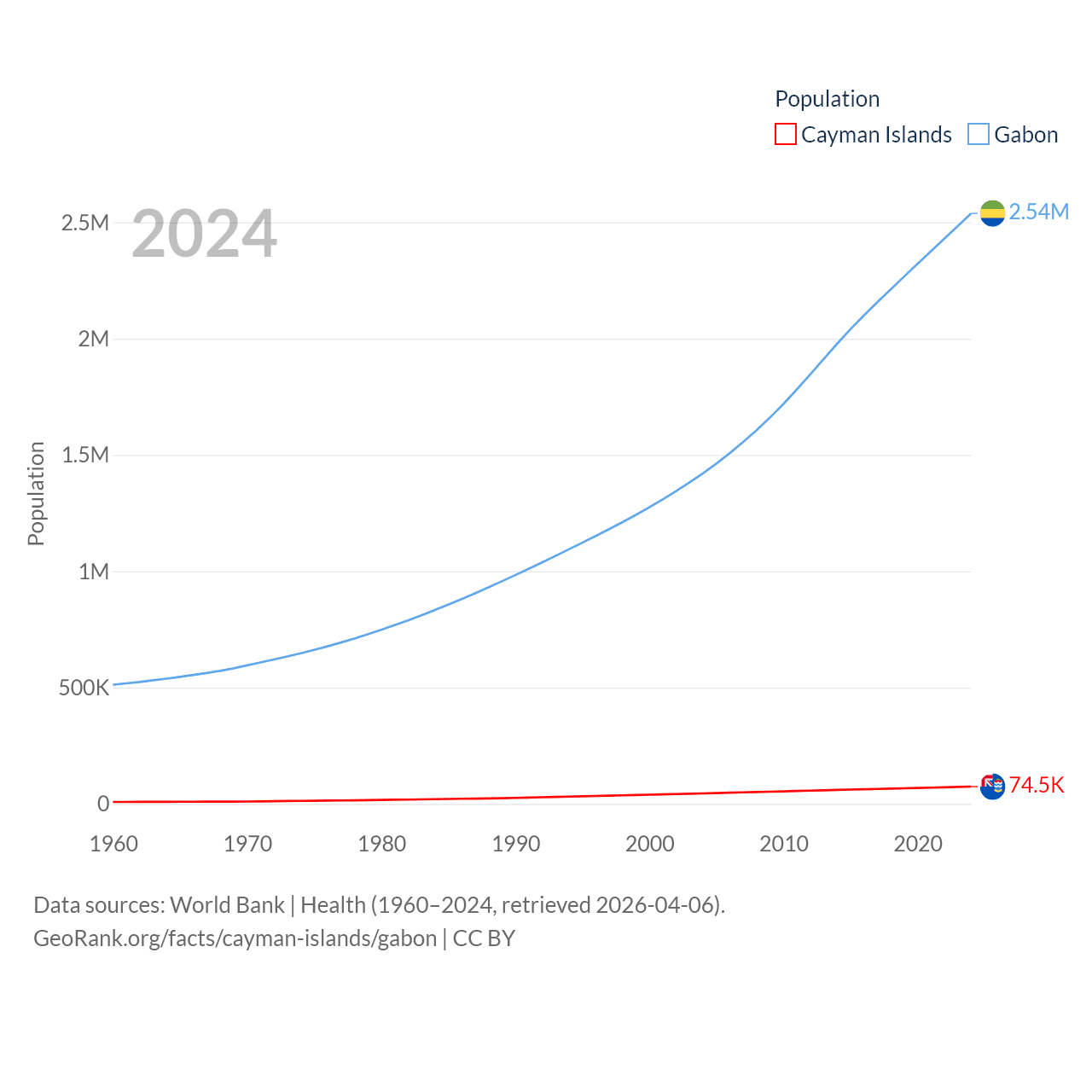 The Cayman Islands has a population of 74.5K (ranked 187/197), compared with 2.54M in Gabon (ranked 141/197). The Cayman Islands' land area is 92.7 sq mi versus 99,487 sq mi for Gabon (ranked 190th vs. 75th).