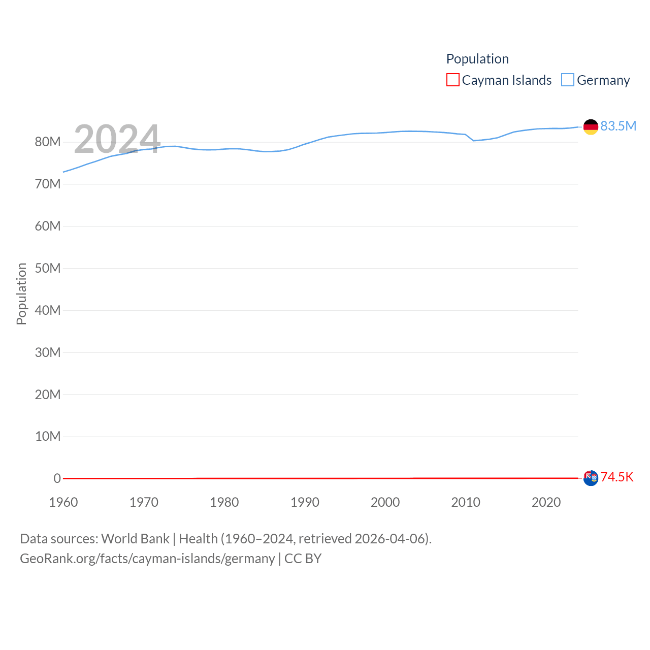The Cayman Islands has a population of 74.5K (ranked 187/197), compared with 83.5M in Germany (ranked 19/197). The Cayman Islands' land area is 92.7 sq mi versus 134,916 sq mi for Germany (ranked 190th vs. 63rd).