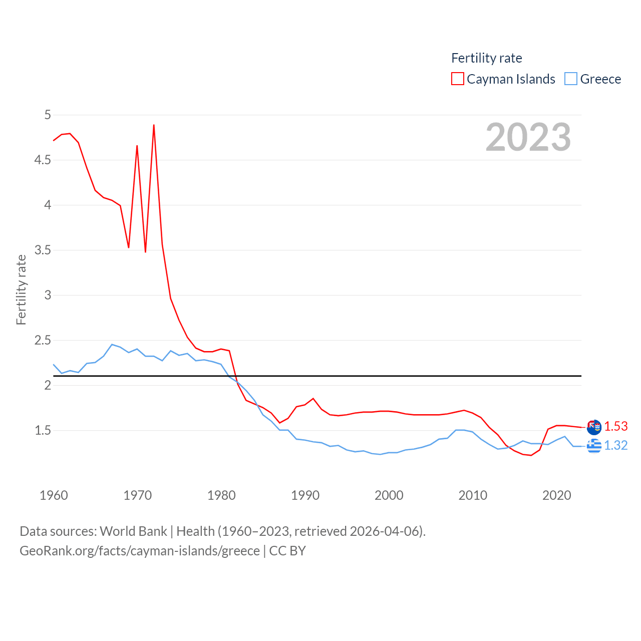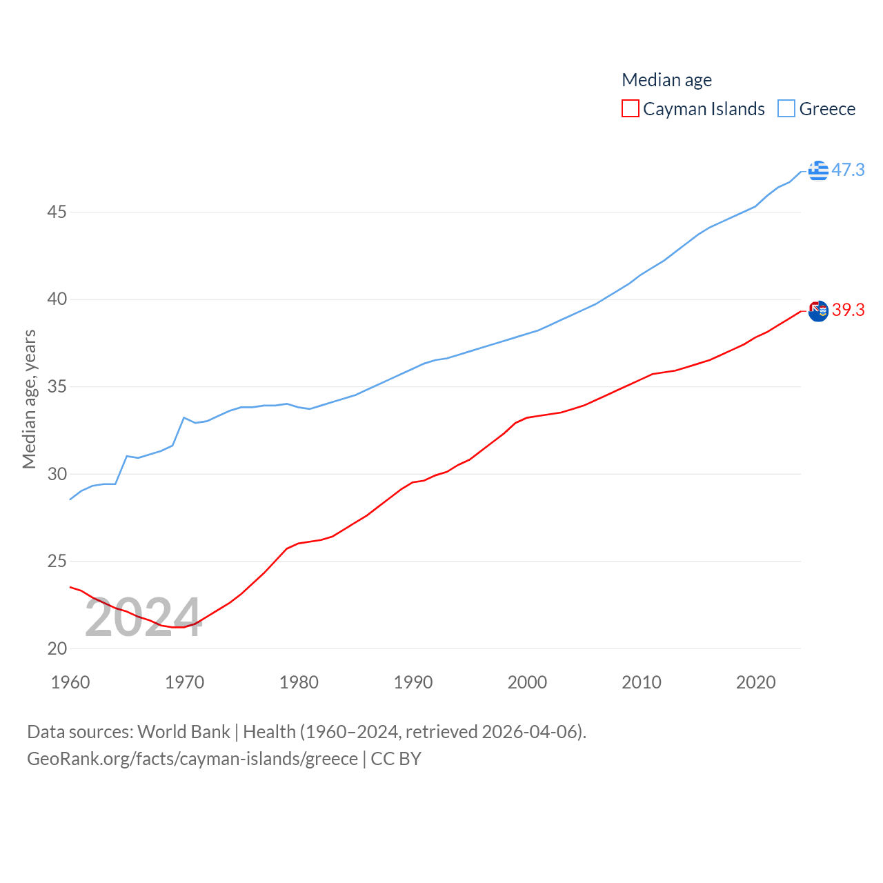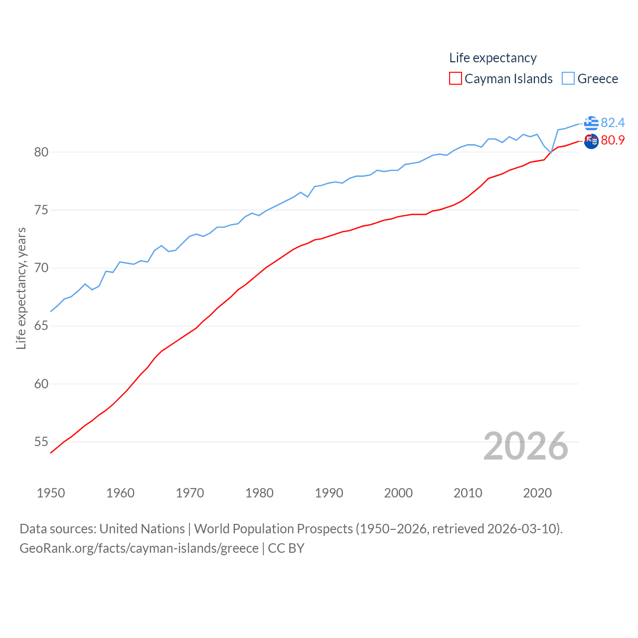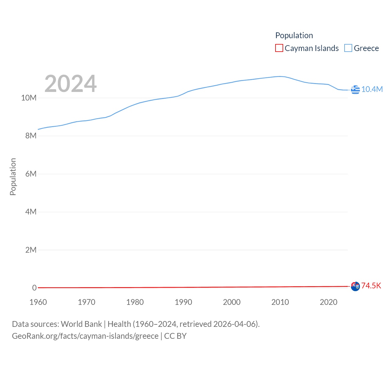 The Cayman Islands has a population of 74.5K (ranked 187/197), compared with 10.4M in Greece (ranked 94/197). The Cayman Islands' land area is 92.7 sq mi versus 49,769 sq mi for Greece (ranked 190th vs. 95th).
