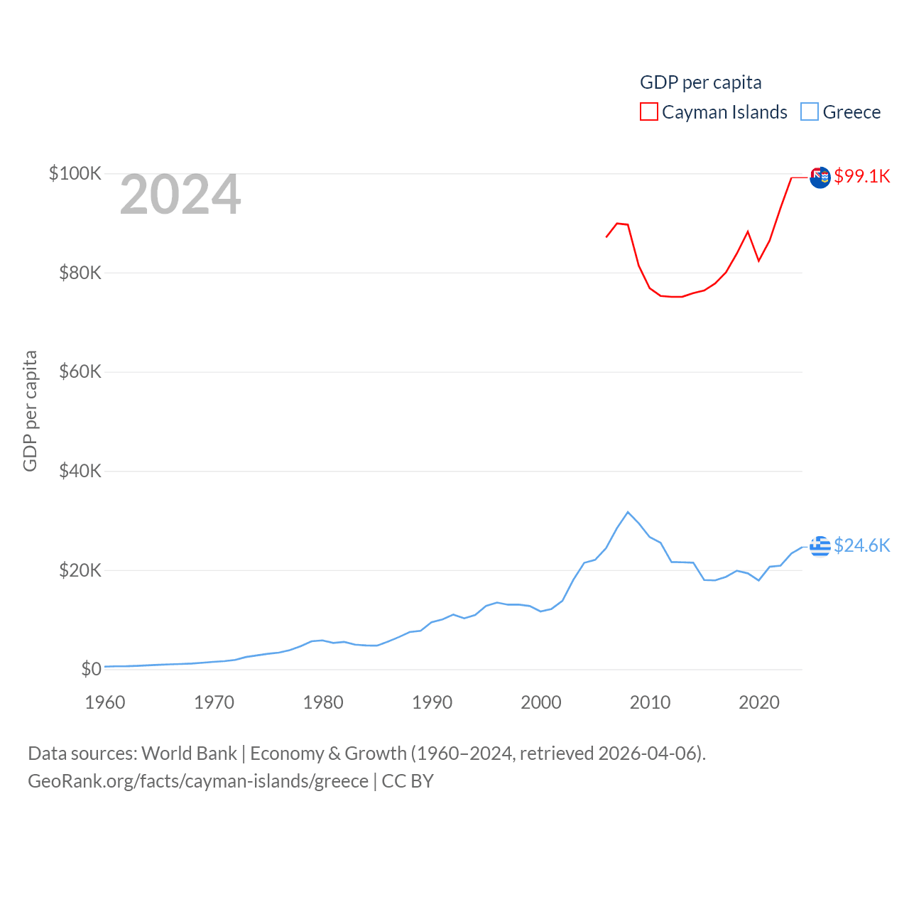 By GDP, The Cayman Islands ranks 158/197 ($7.24B) and Greece ranks 53/197 ($256B). By GDP per capita, The Cayman Islands ranks 6/197 ($99,144), while Greece ranks 49/197 ($24,626).