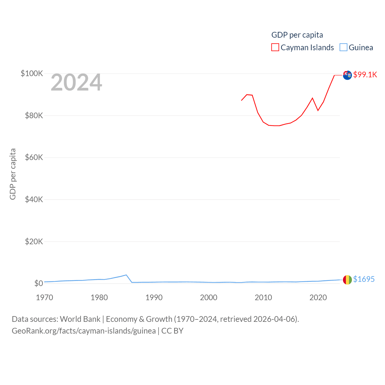 By GDP, The Cayman Islands ranks 158/197 ($7.24B) and Guinea ranks 118/197 ($25B). By GDP per capita, The Cayman Islands ranks 6/197 ($99,144), while Guinea ranks 160/197 ($1,695).