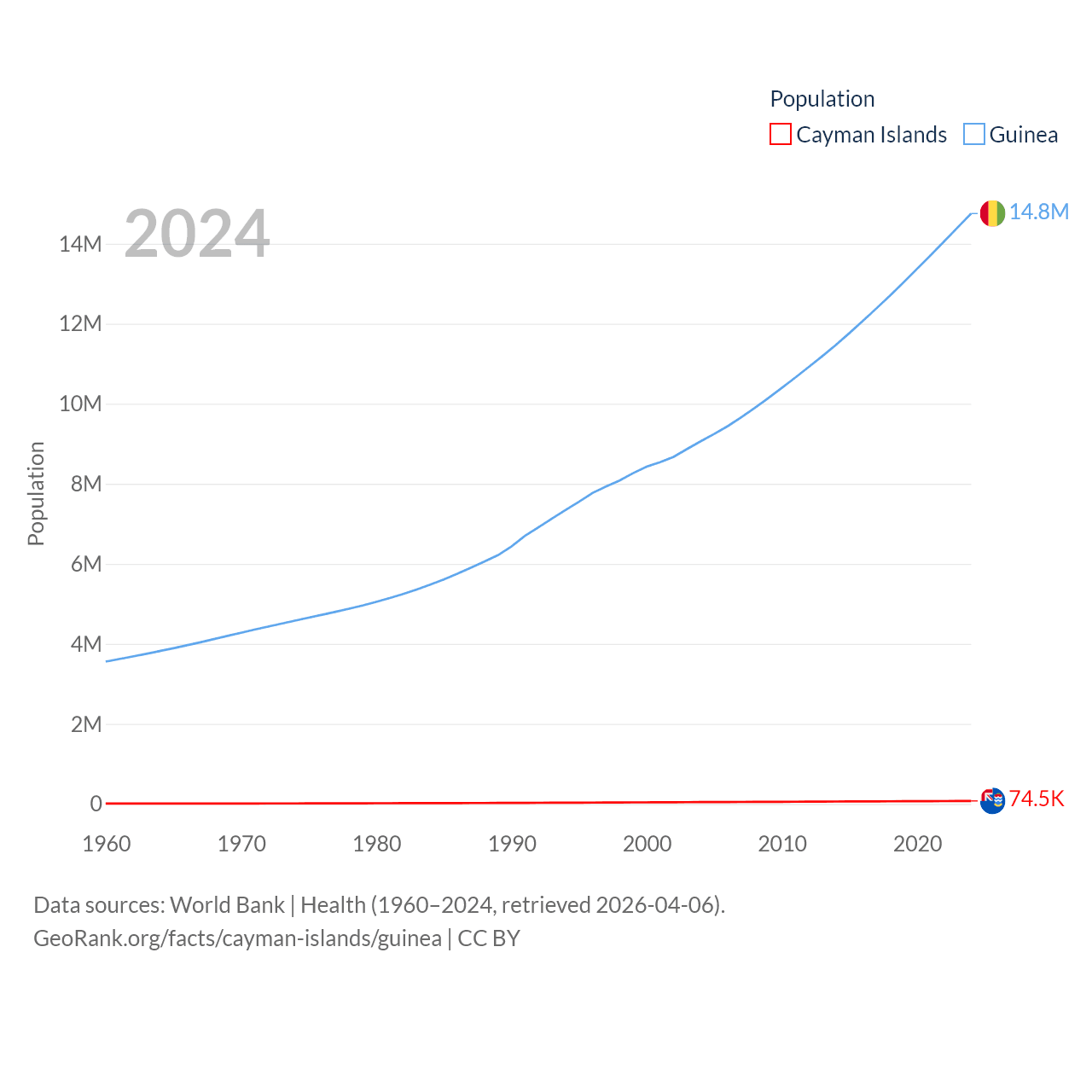 The Cayman Islands has a population of 74.5K (ranked 187/197), compared with 14.8M in Guinea (ranked 75/197). The Cayman Islands' land area is 92.7 sq mi versus 94,873 sq mi for Guinea (ranked 190th vs. 77th).