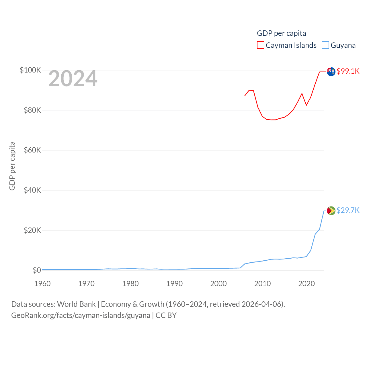 By GDP, The Cayman Islands ranks 158/197 ($7.24B) and Guyana ranks 120/197 ($24.7B). By GDP per capita, The Cayman Islands ranks 6/197 ($99,144), while Guyana ranks 41/197 ($29,675).
