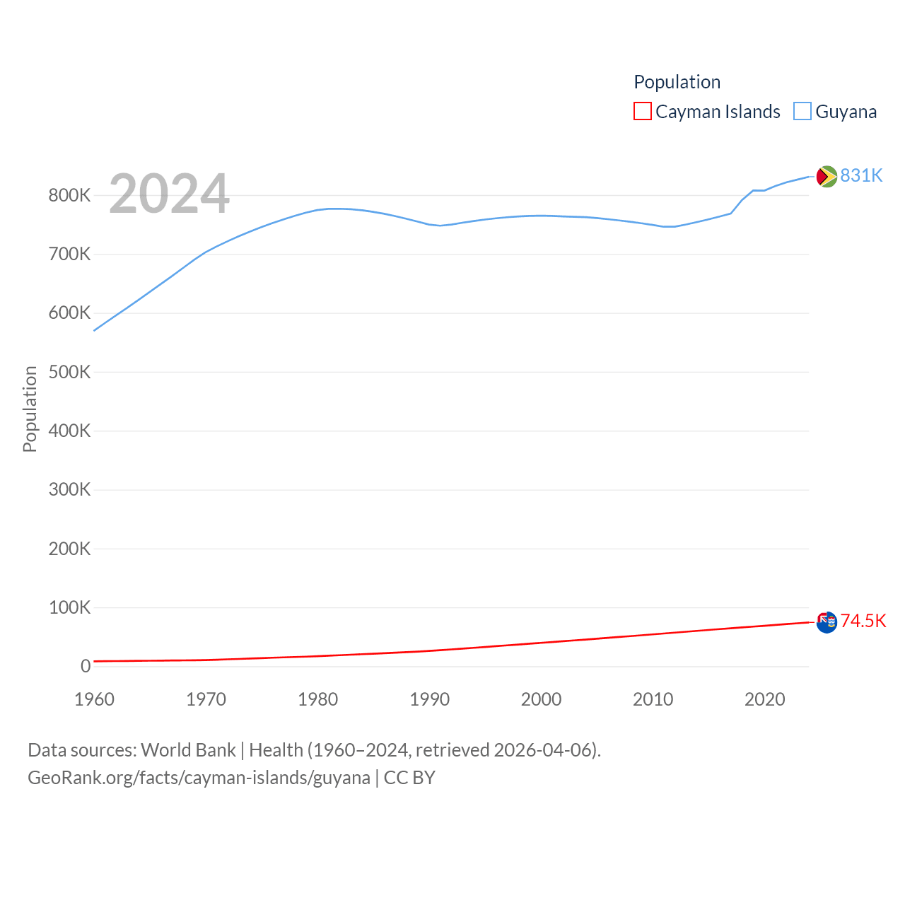 The Cayman Islands has a population of 74.5K (ranked 187/197), compared with 831K in Guyana (ranked 161/197). The Cayman Islands' land area is 92.7 sq mi versus 81,522 sq mi for Guyana (ranked 190th vs. 82nd).