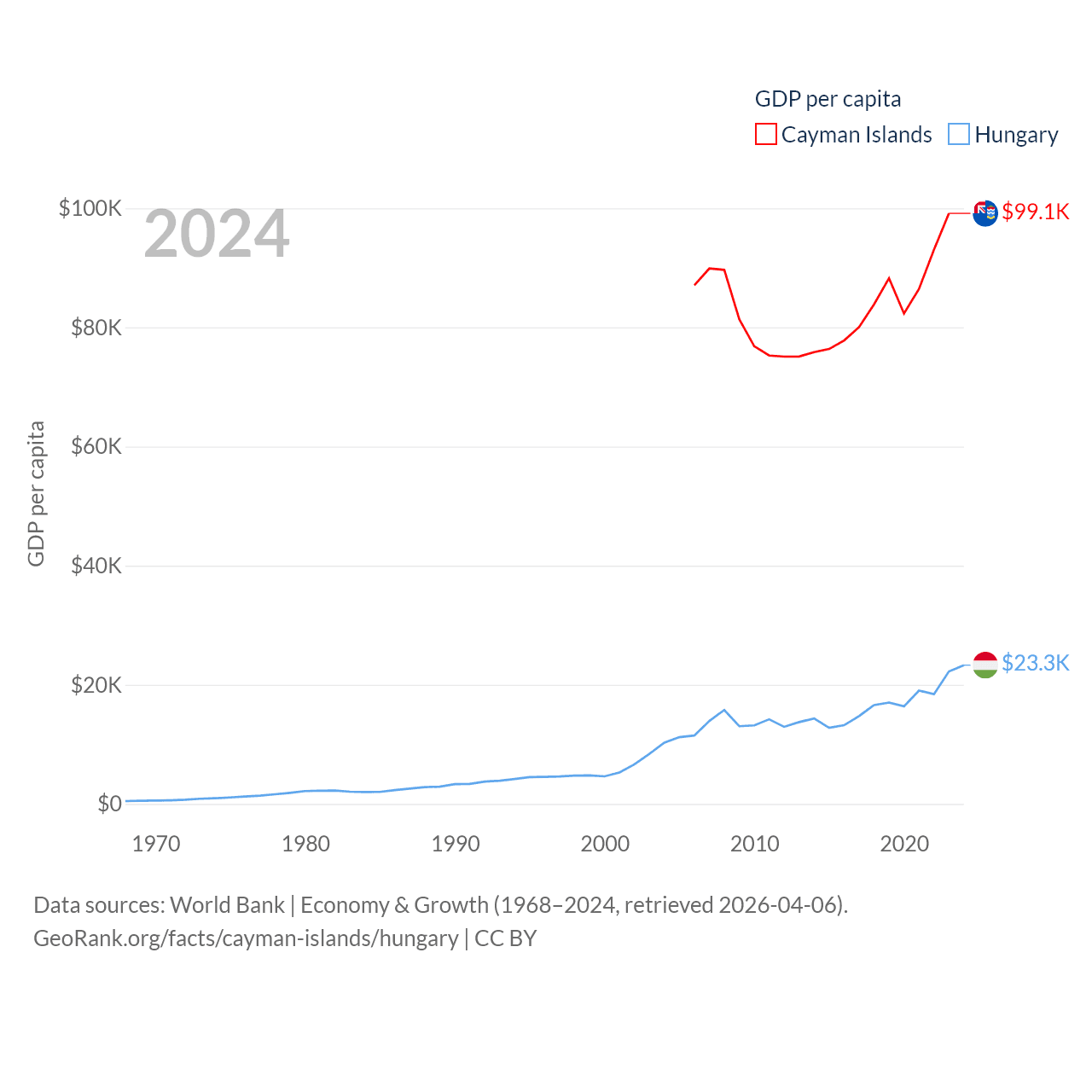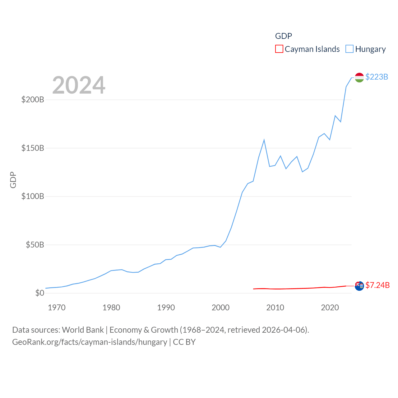 By GDP, The Cayman Islands ranks 158/197 ($7.24B) and Hungary ranks 55/197 ($223B). By GDP per capita, The Cayman Islands ranks 6/197 ($99,144), while Hungary ranks 55/197 ($23,292).