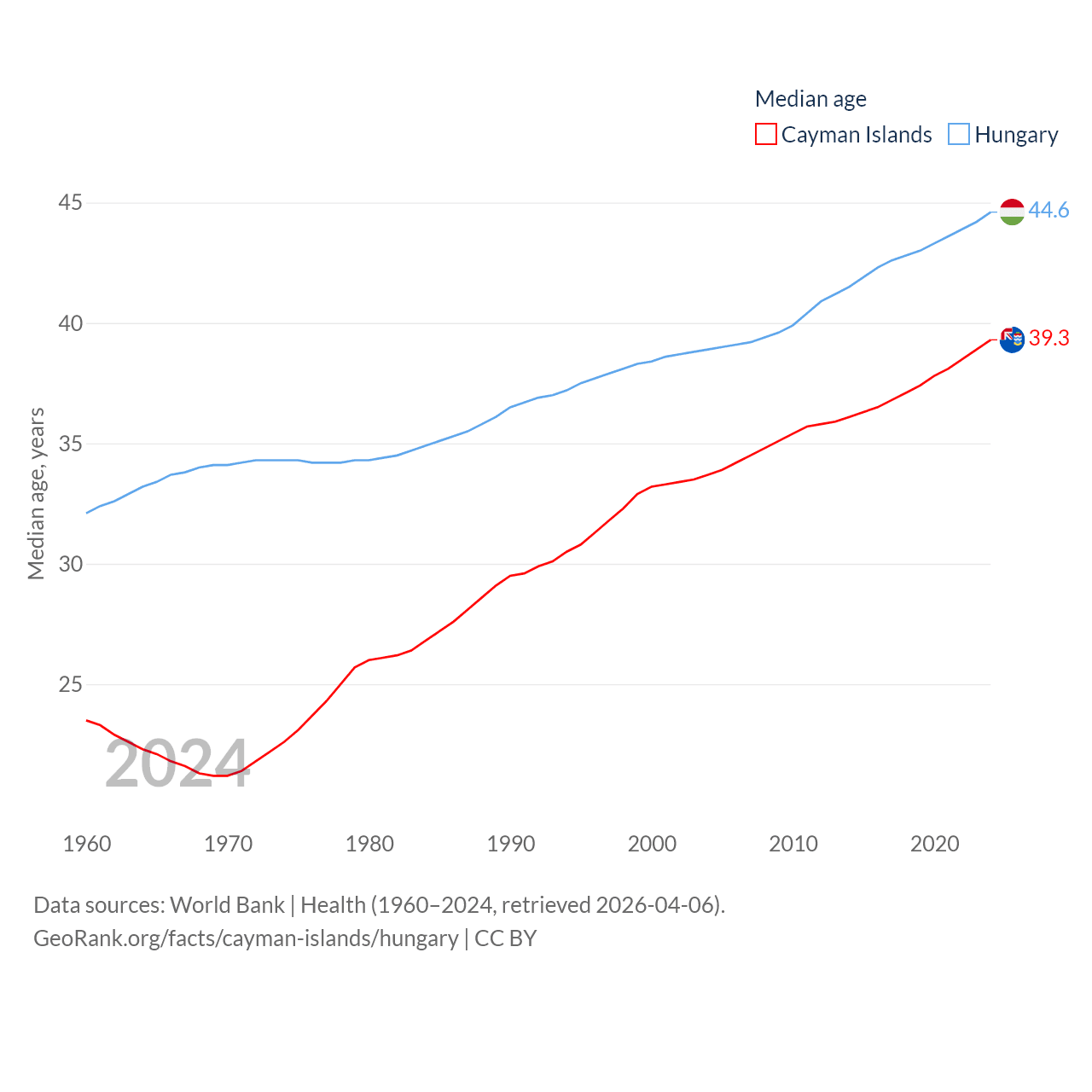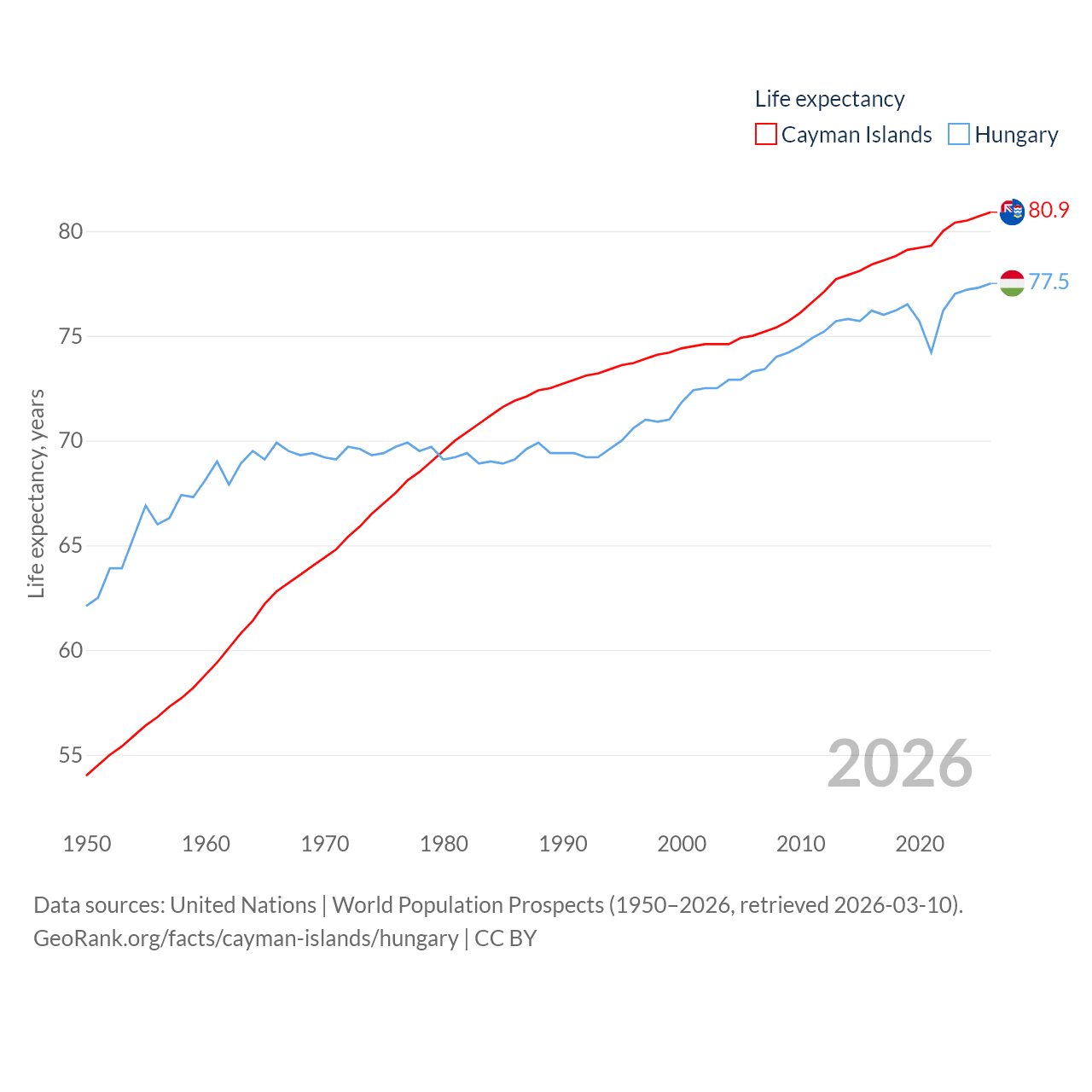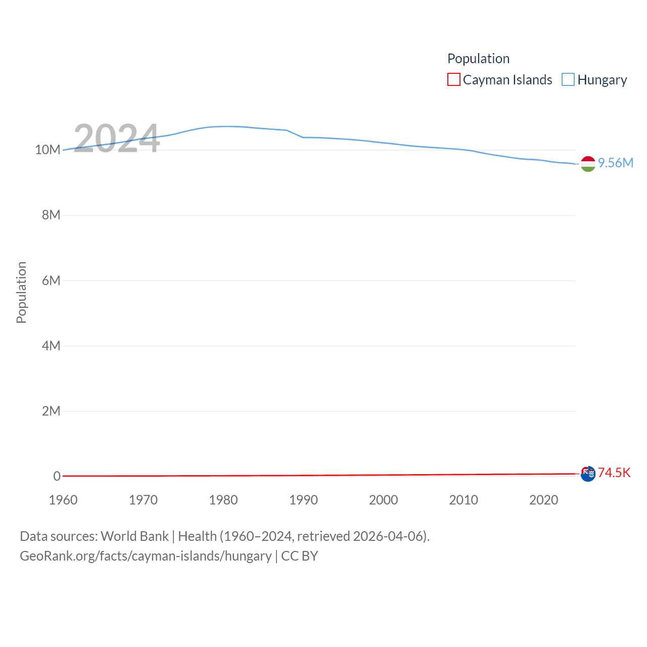 The Cayman Islands has a population of 74.5K (ranked 187/197), compared with 9.56M in Hungary (ranked 97/197). The Cayman Islands' land area is 92.7 sq mi versus 35,236 sq mi for Hungary (ranked 190th vs. 109th).