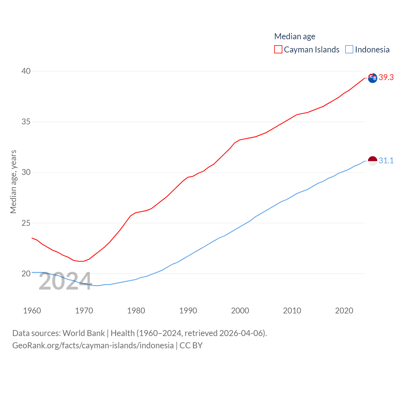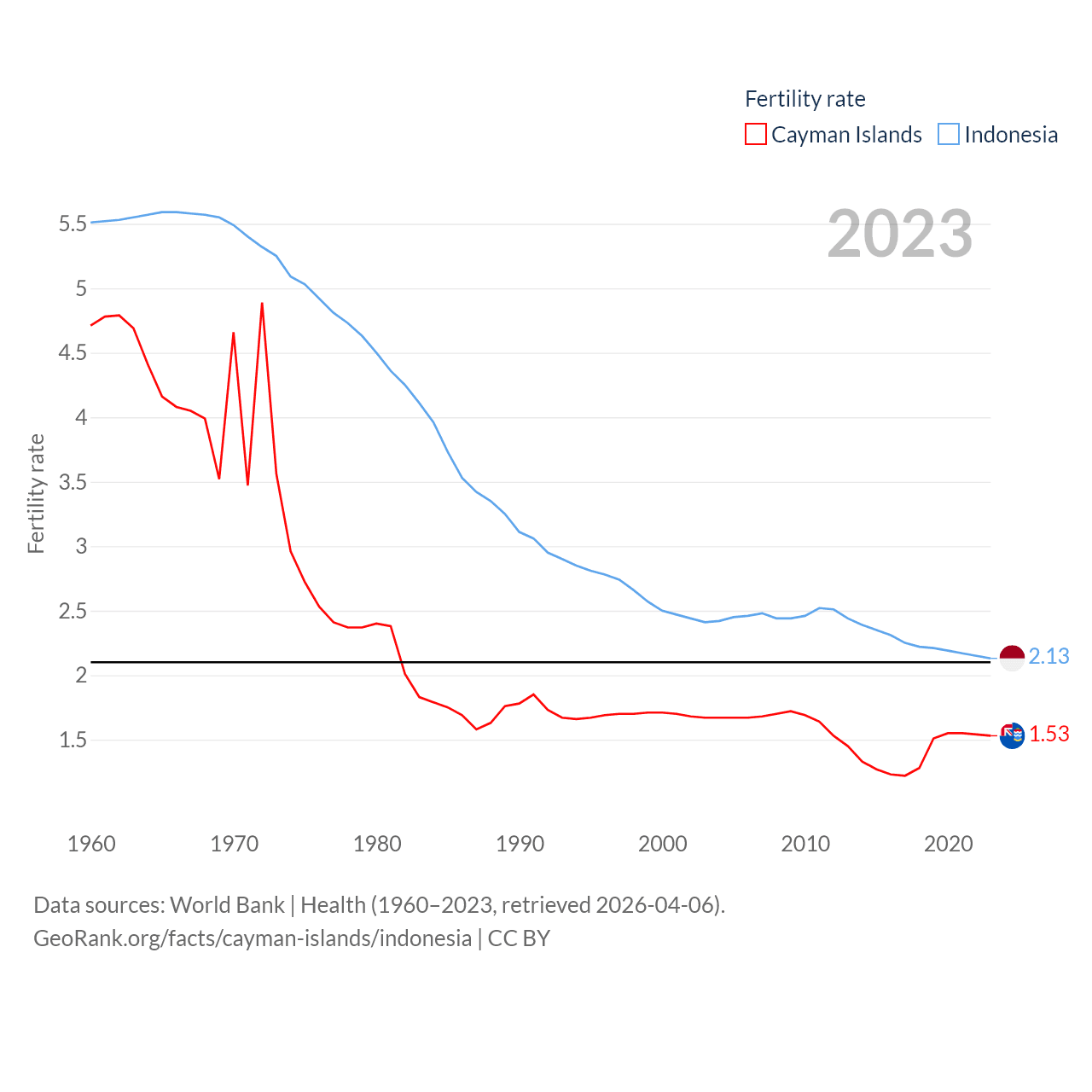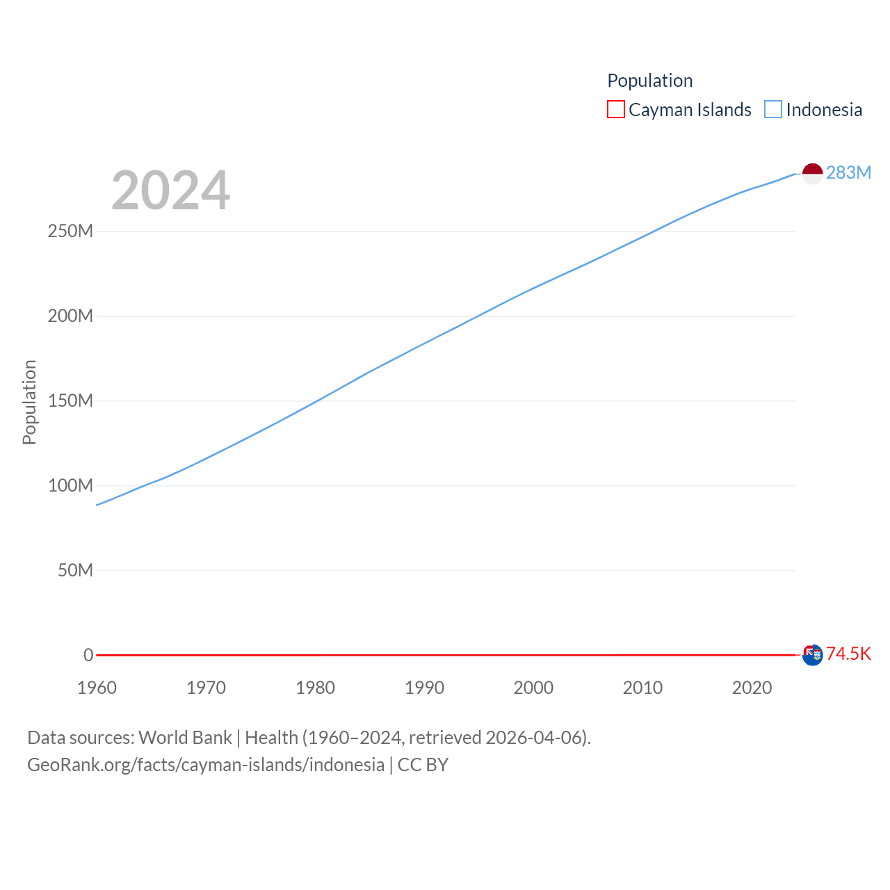 The Cayman Islands has a population of 74.5K (ranked 187/197), compared with 283M in Indonesia (ranked 4/197). The Cayman Islands' land area is 92.7 sq mi versus 730,720 sq mi for Indonesia (ranked 190th vs. 14th).