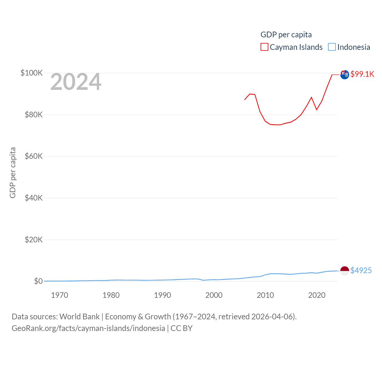 By GDP, The Cayman Islands ranks 158/197 ($7.24B) and Indonesia ranks 16/197 ($1.4T). By GDP per capita, The Cayman Islands ranks 6/197 ($99,144), while Indonesia ranks 121/197 ($4,925).