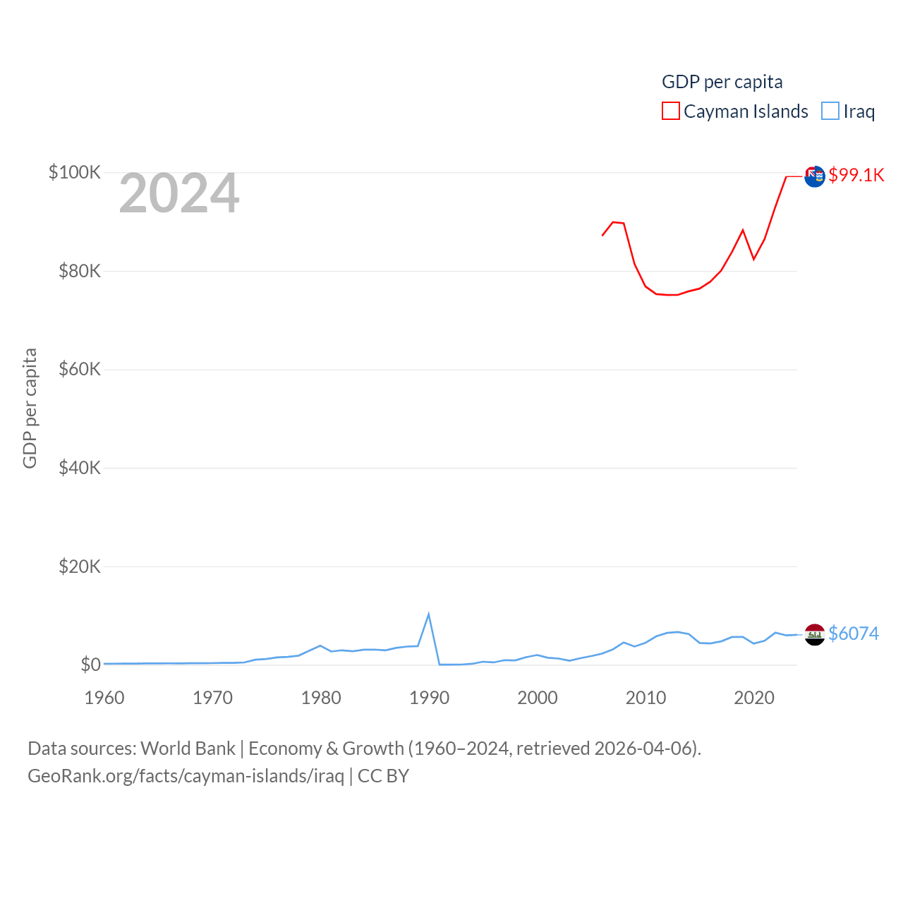By GDP, The Cayman Islands ranks 158/197 ($7.24B) and Iraq ranks 50/197 ($280B). By GDP per capita, The Cayman Islands ranks 6/197 ($99,144), while Iraq ranks 113/197 ($6,074).