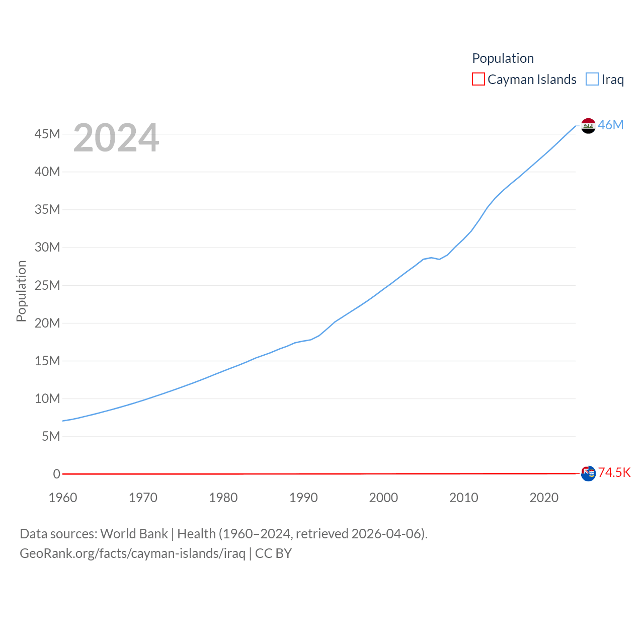 The Cayman Islands has a population of 74.5K (ranked 187/197), compared with 46M in Iraq (ranked 34/197). The Cayman Islands' land area is 92.7 sq mi versus 167,619 sq mi for Iraq (ranked 190th vs. 57th).