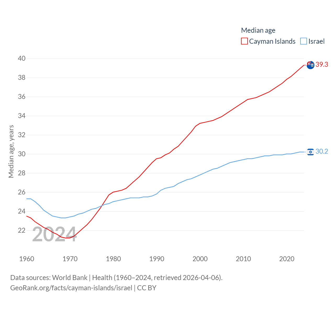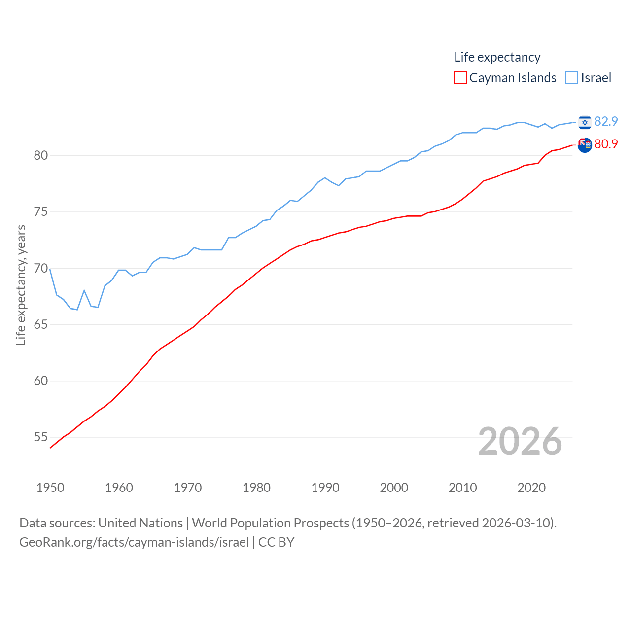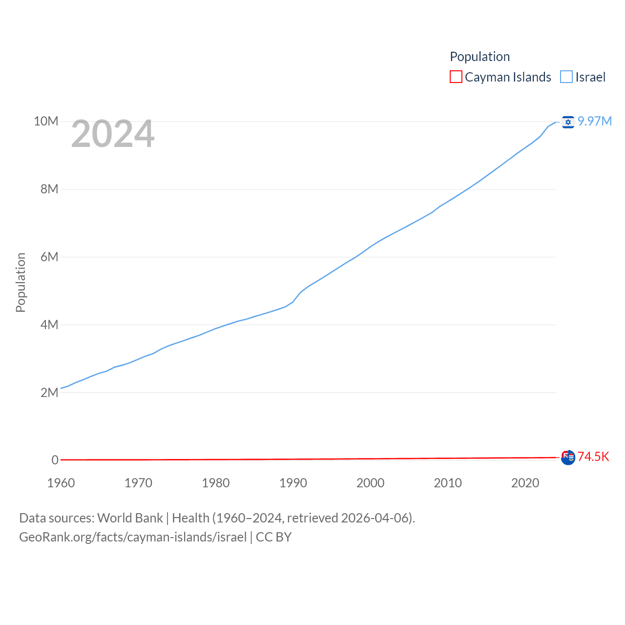 The Cayman Islands has a population of 74.5K (ranked 187/197), compared with 9.97M in Israel (ranked 96/197). The Cayman Islands' land area is 92.7 sq mi versus 8,355 sq mi for Israel (ranked 190th vs. 149th).
