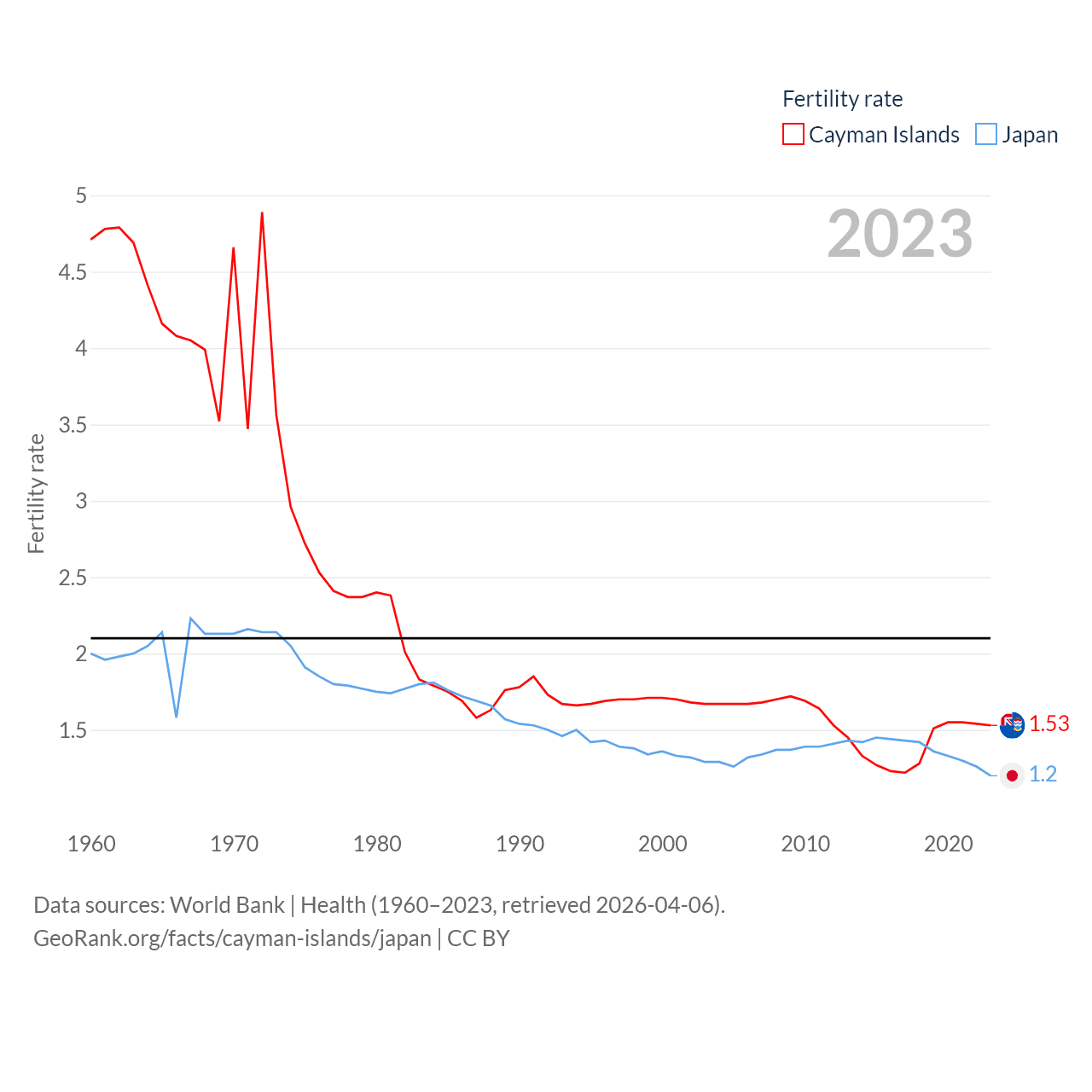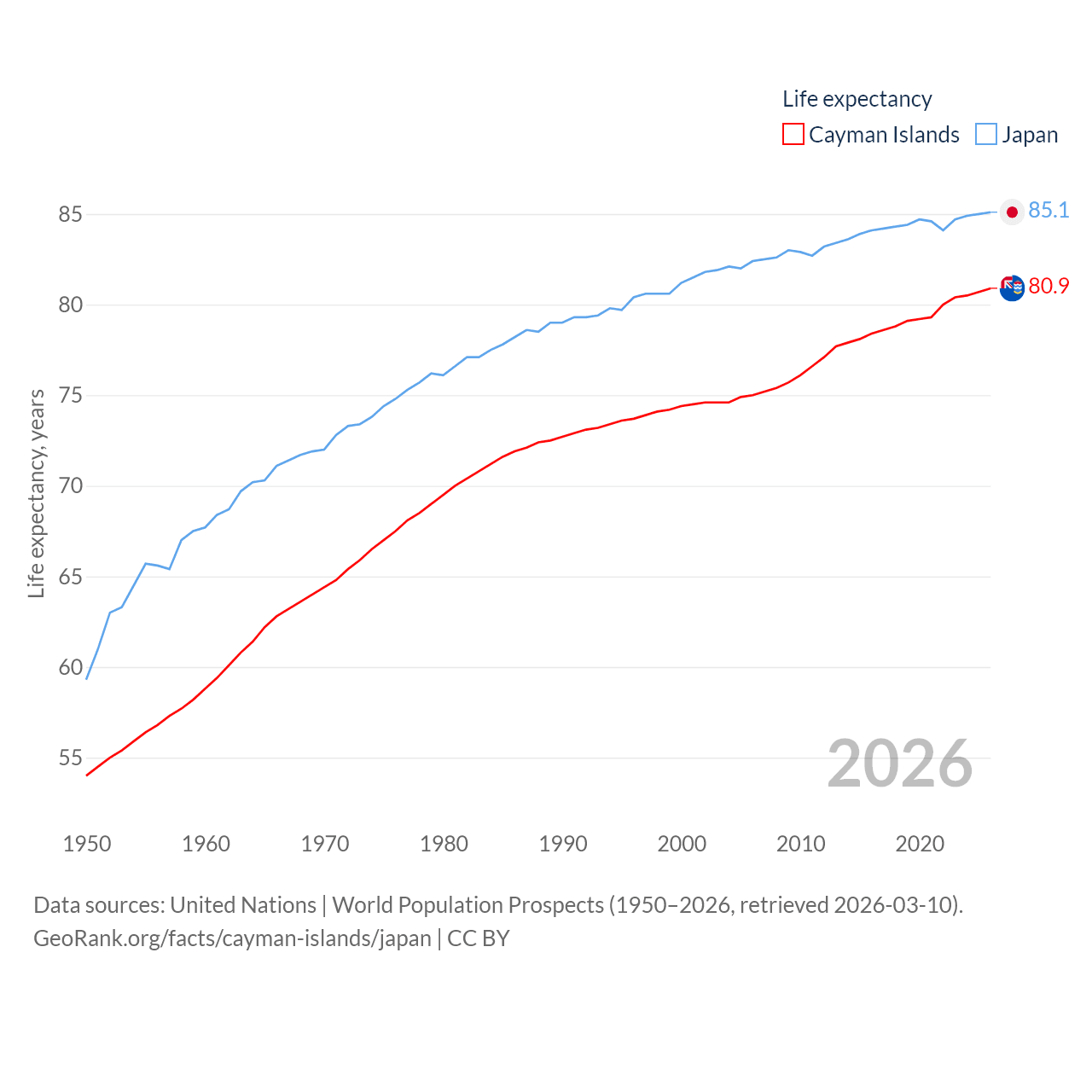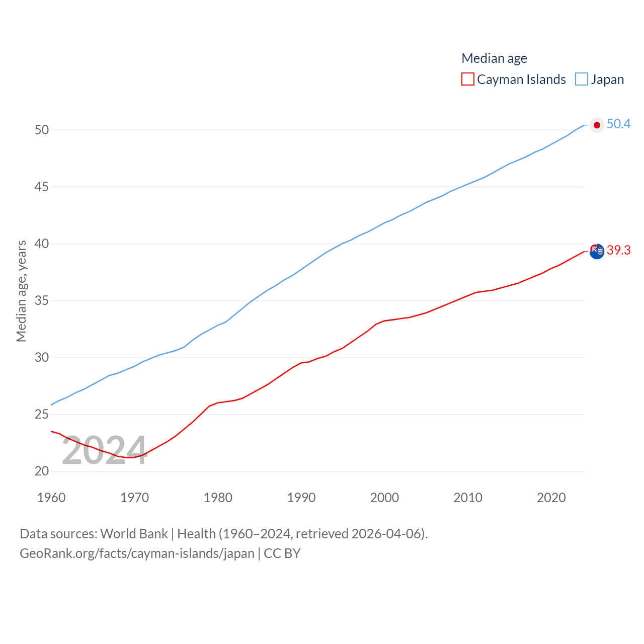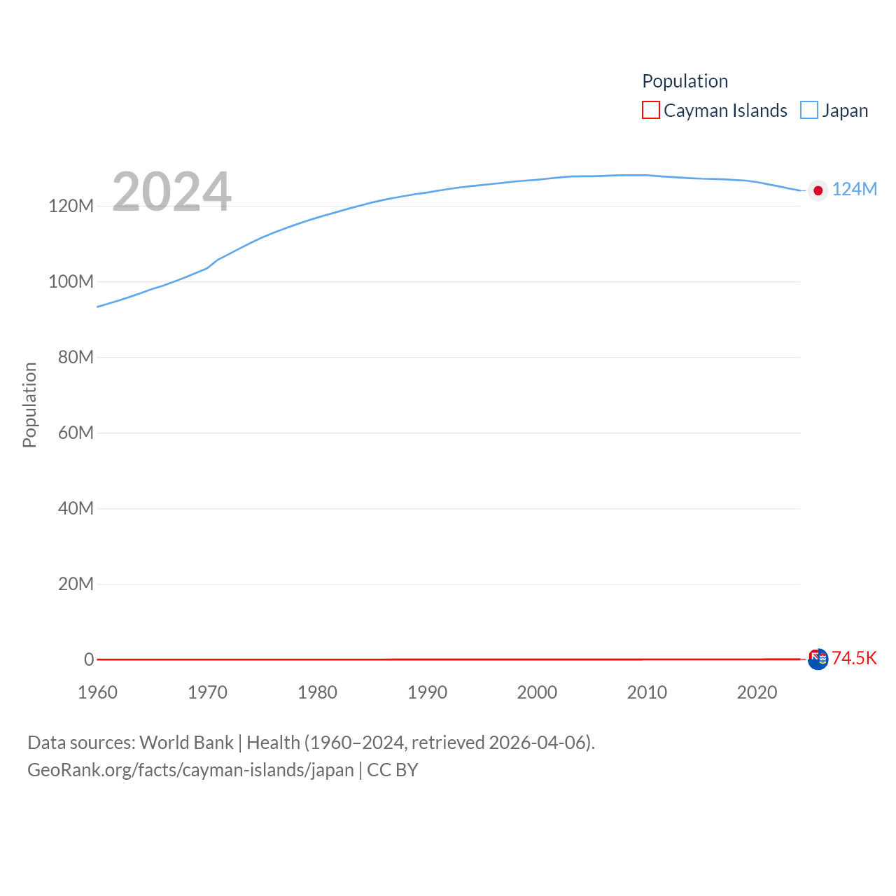 The Cayman Islands has a population of 74.5K (ranked 187/197), compared with 124M in Japan (ranked 12/197). The Cayman Islands' land area is 92.7 sq mi versus 140,761 sq mi for Japan (ranked 190th vs. 61st).