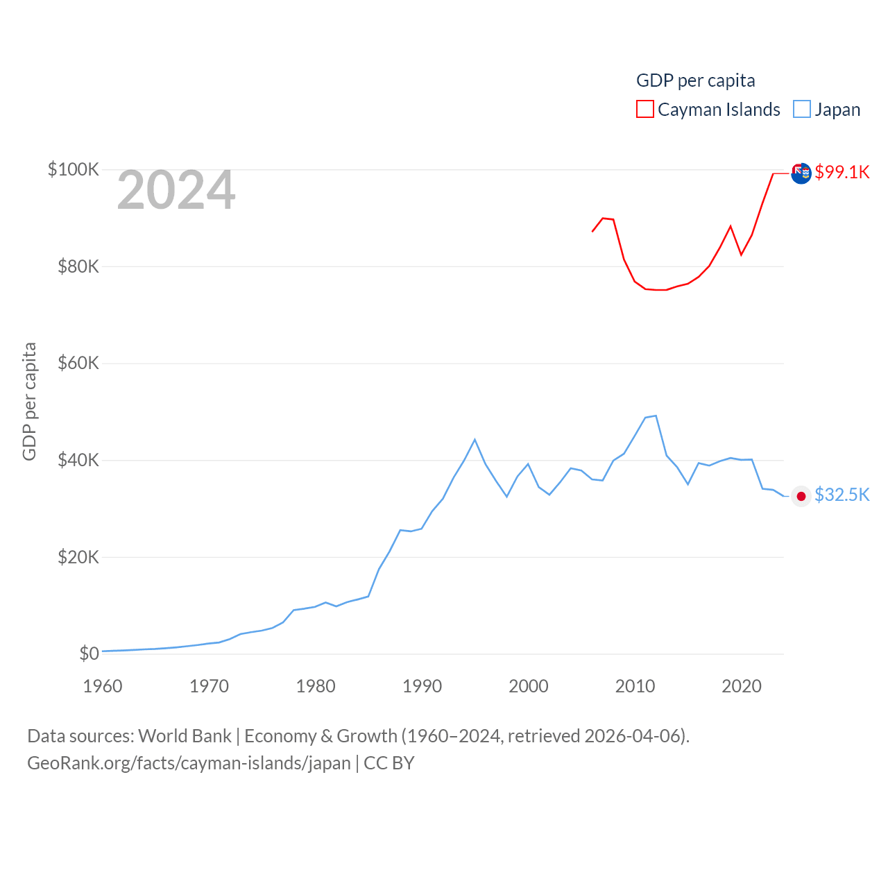 By GDP, The Cayman Islands ranks 158/197 ($7.24B) and Japan ranks 4/197 ($4.03T). By GDP per capita, The Cayman Islands ranks 6/197 ($99,144), while Japan ranks 38/197 ($32,487).