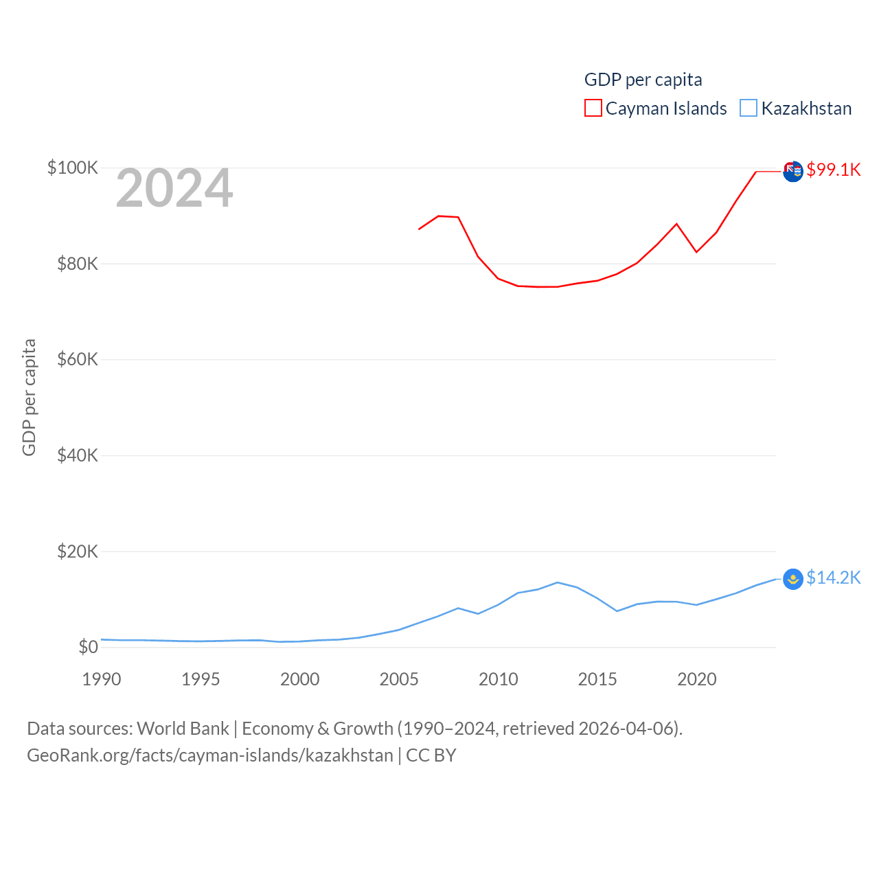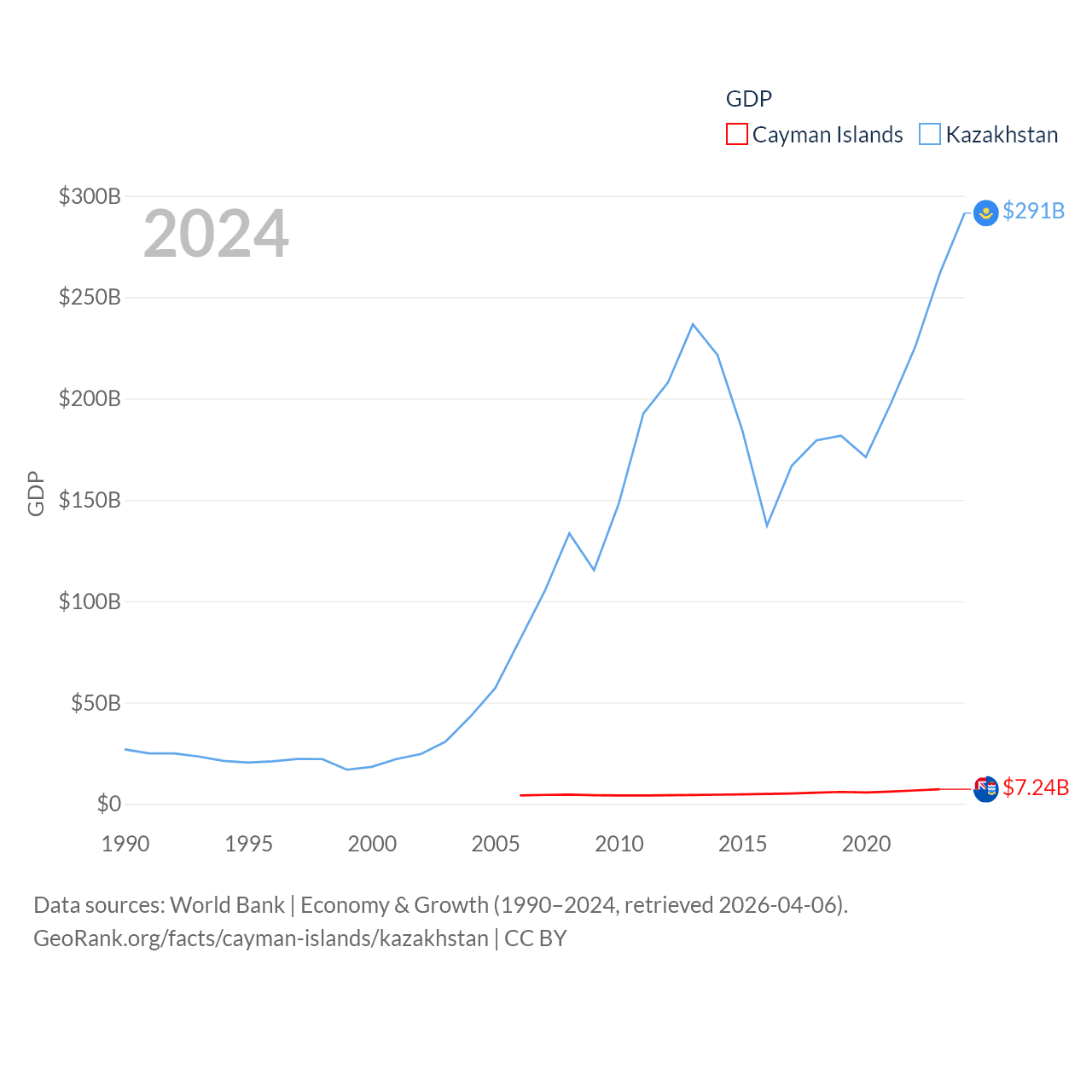 By GDP, The Cayman Islands ranks 158/197 ($7.24B) and Kazakhstan ranks 48/197 ($291B). By GDP per capita, The Cayman Islands ranks 6/197 ($99,144), while Kazakhstan ranks 71/197 ($14,155).