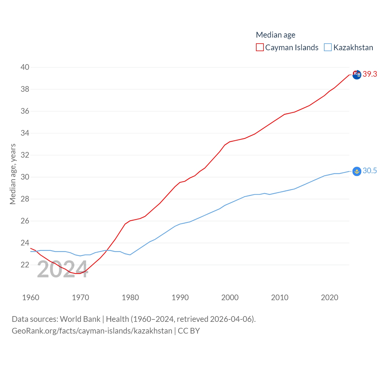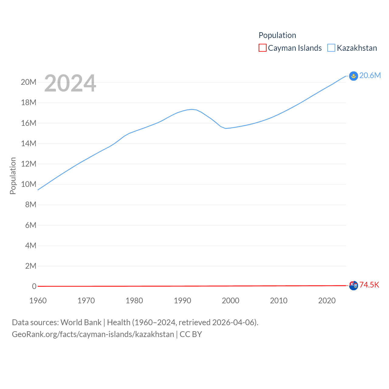 The Cayman Islands has a population of 74.5K (ranked 187/197), compared with 20.6M in Kazakhstan (ranked 64/197). The Cayman Islands' land area is 92.7 sq mi versus 1,042,360 sq mi for Kazakhstan (ranked 190th vs. 9th).