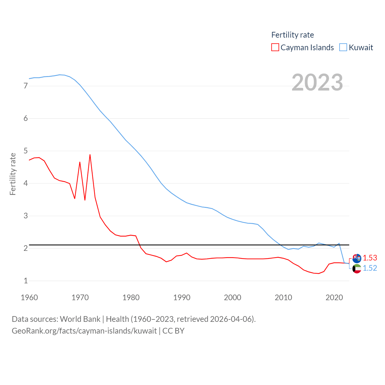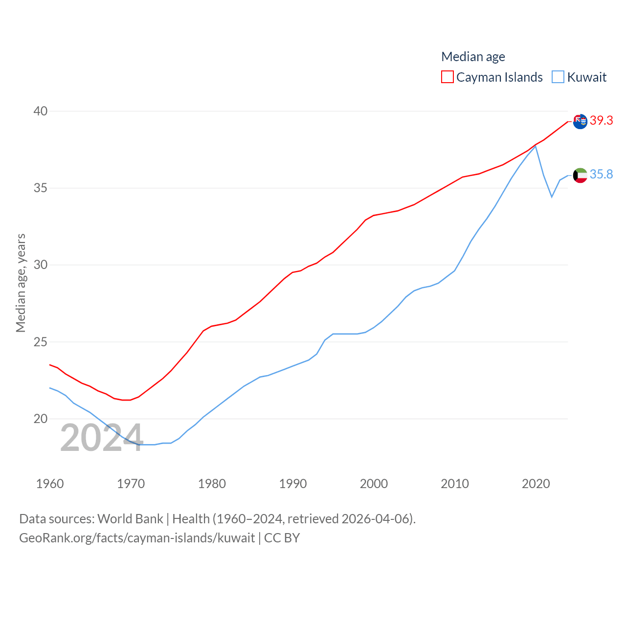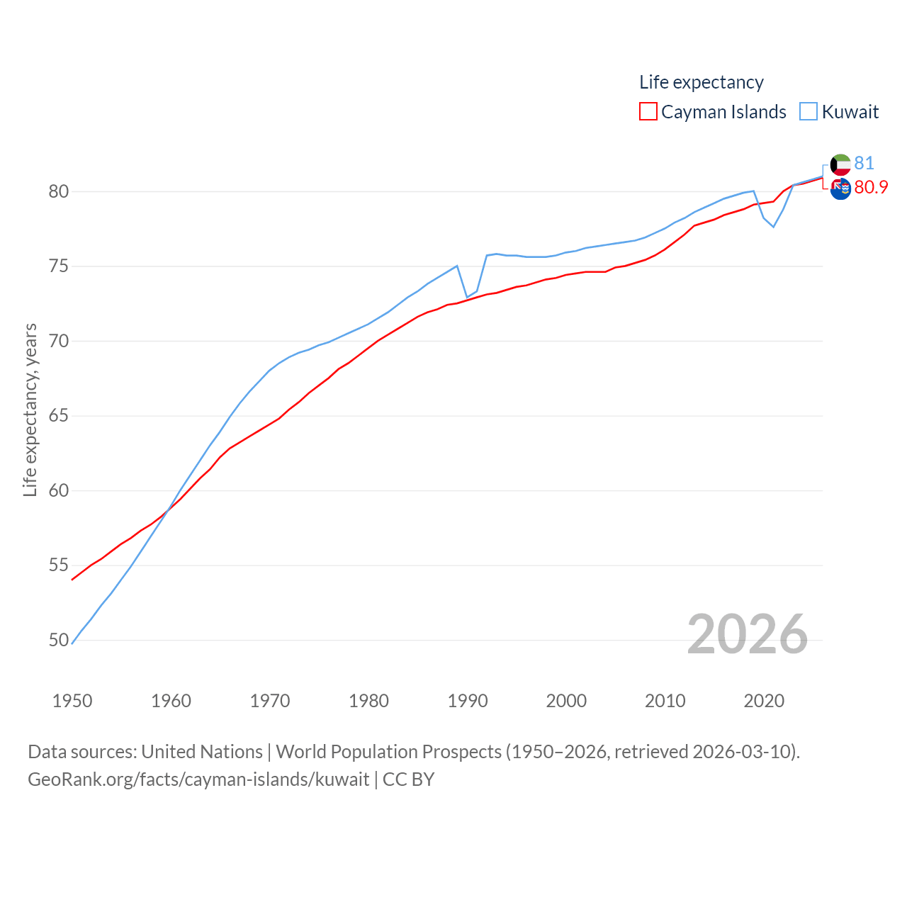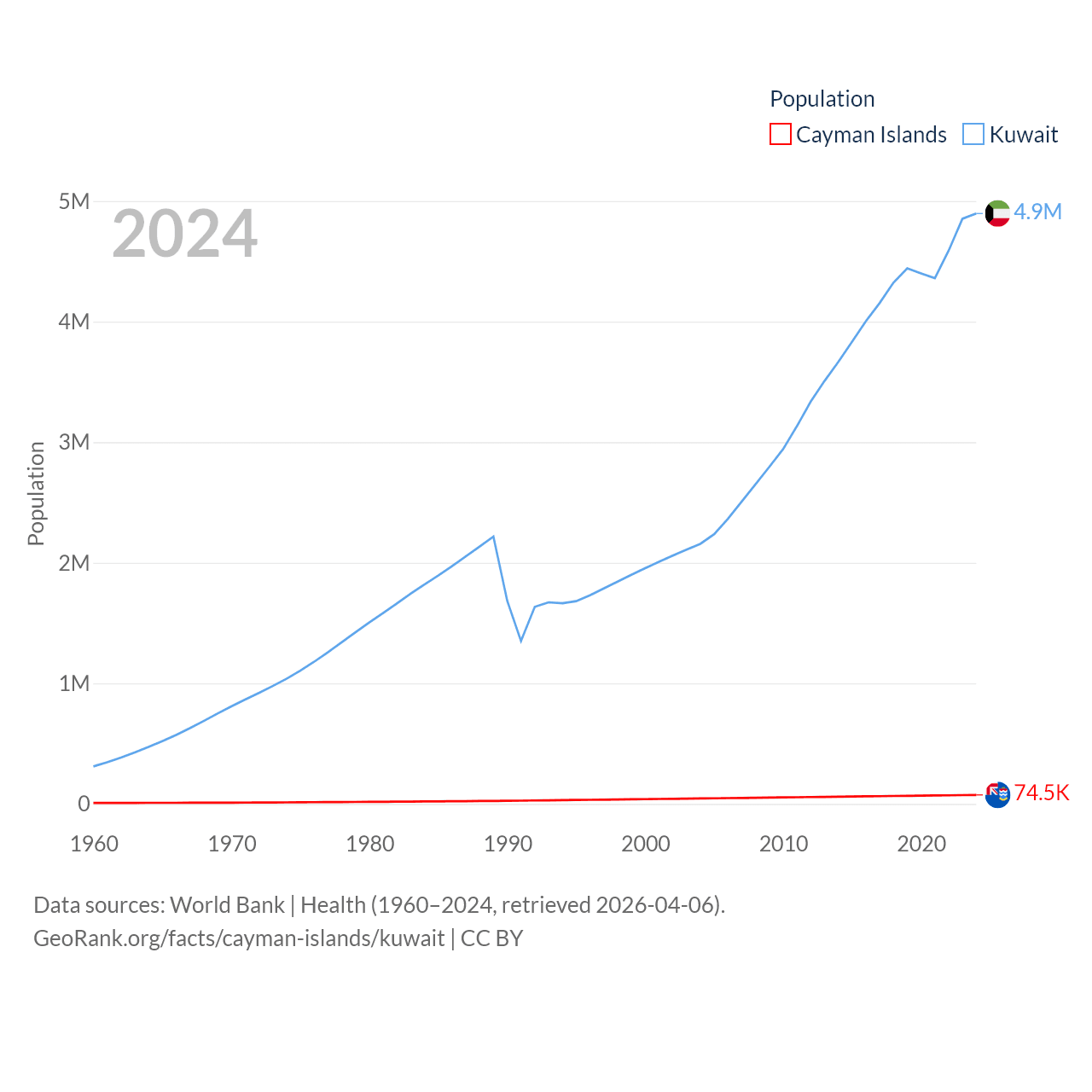 The Cayman Islands has a population of 74.5K (ranked 187/197), compared with 4.9M in Kuwait (ranked 127/197). The Cayman Islands' land area is 92.7 sq mi versus 6,880 sq mi for Kuwait (ranked 190th vs. 153rd).