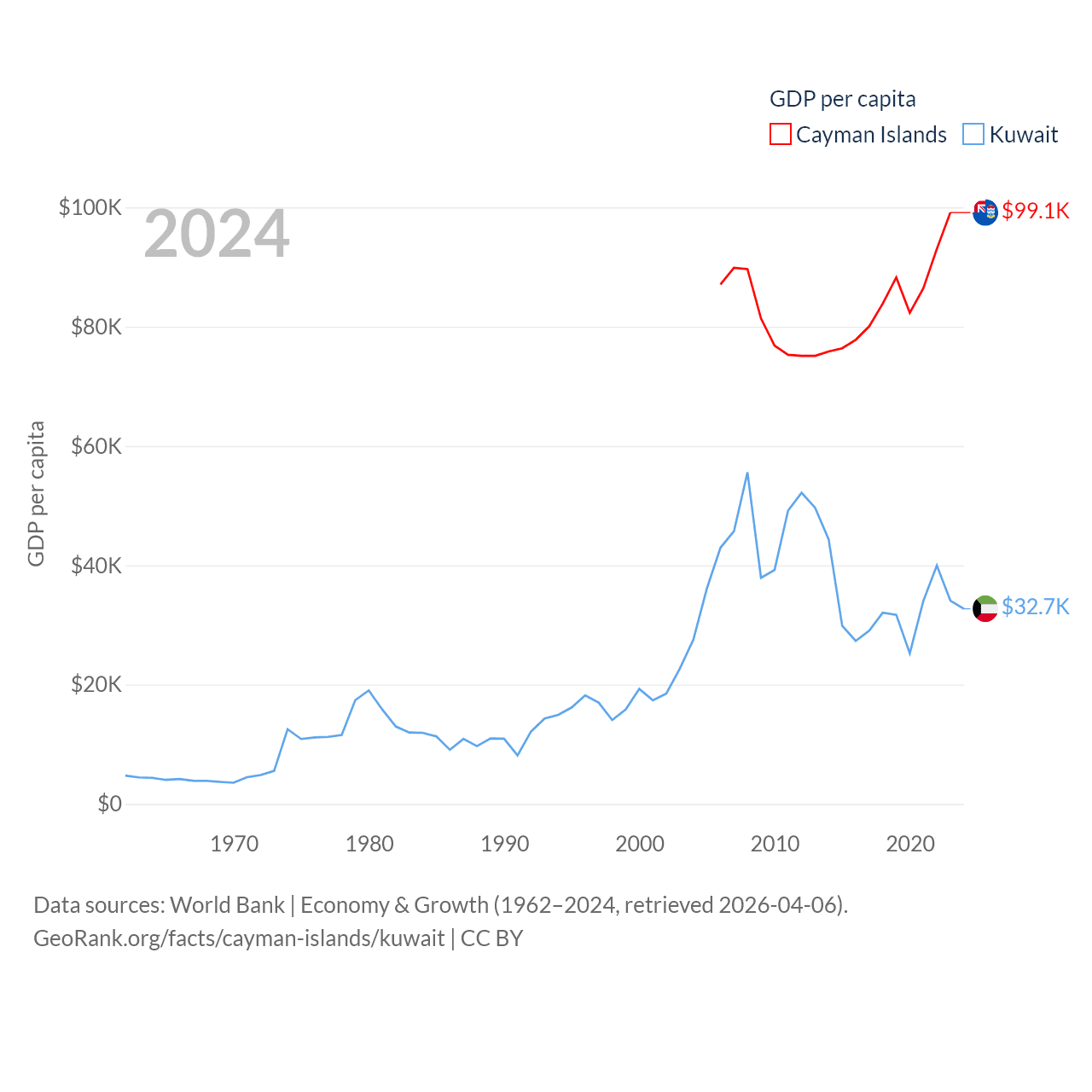 By GDP, The Cayman Islands ranks 158/197 ($7.24B) and Kuwait ranks 59/197 ($160B). By GDP per capita, The Cayman Islands ranks 6/197 ($99,144), while Kuwait ranks 37/197 ($32,718).