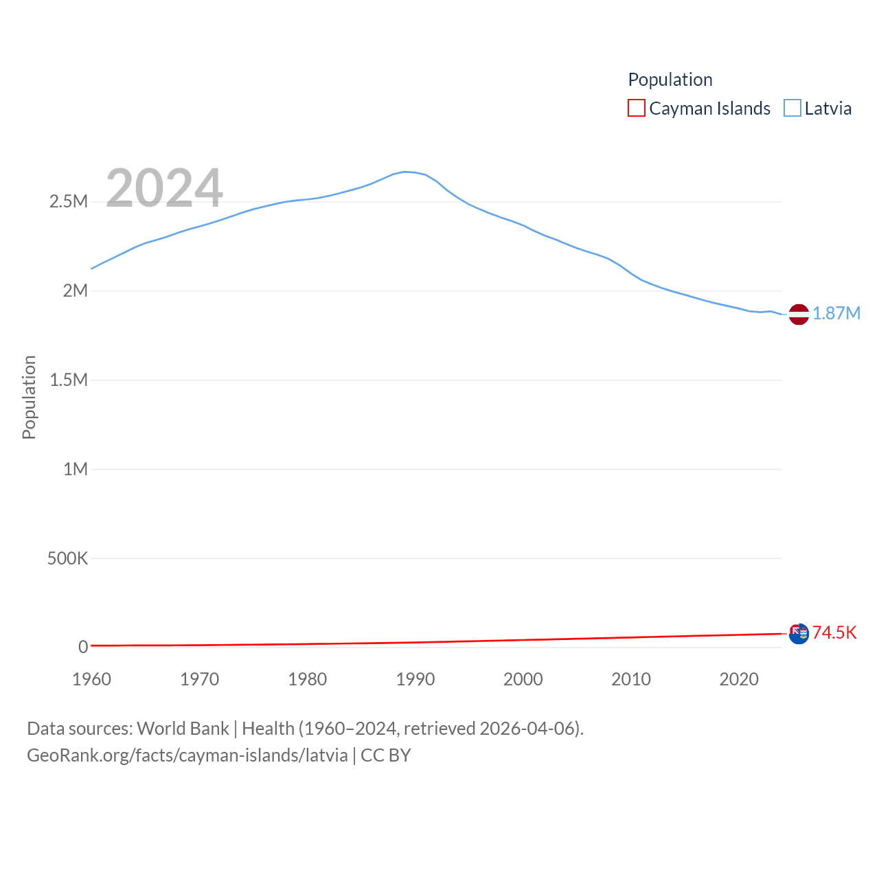 The Cayman Islands has a population of 74.5K (ranked 187/197), compared with 1.87M in Latvia (ranked 149/197). The Cayman Islands' land area is 92.7 sq mi versus 24,027 sq mi for Latvia (ranked 190th vs. 121st).