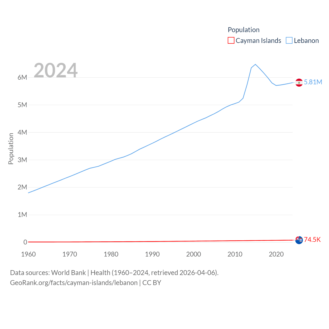 The Cayman Islands has a population of 74.5K (ranked 187/197), compared with 5.81M in Lebanon (ranked 115/197). The Cayman Islands' land area is 92.7 sq mi versus 3,950 sq mi for Lebanon (ranked 190th vs. 160th).