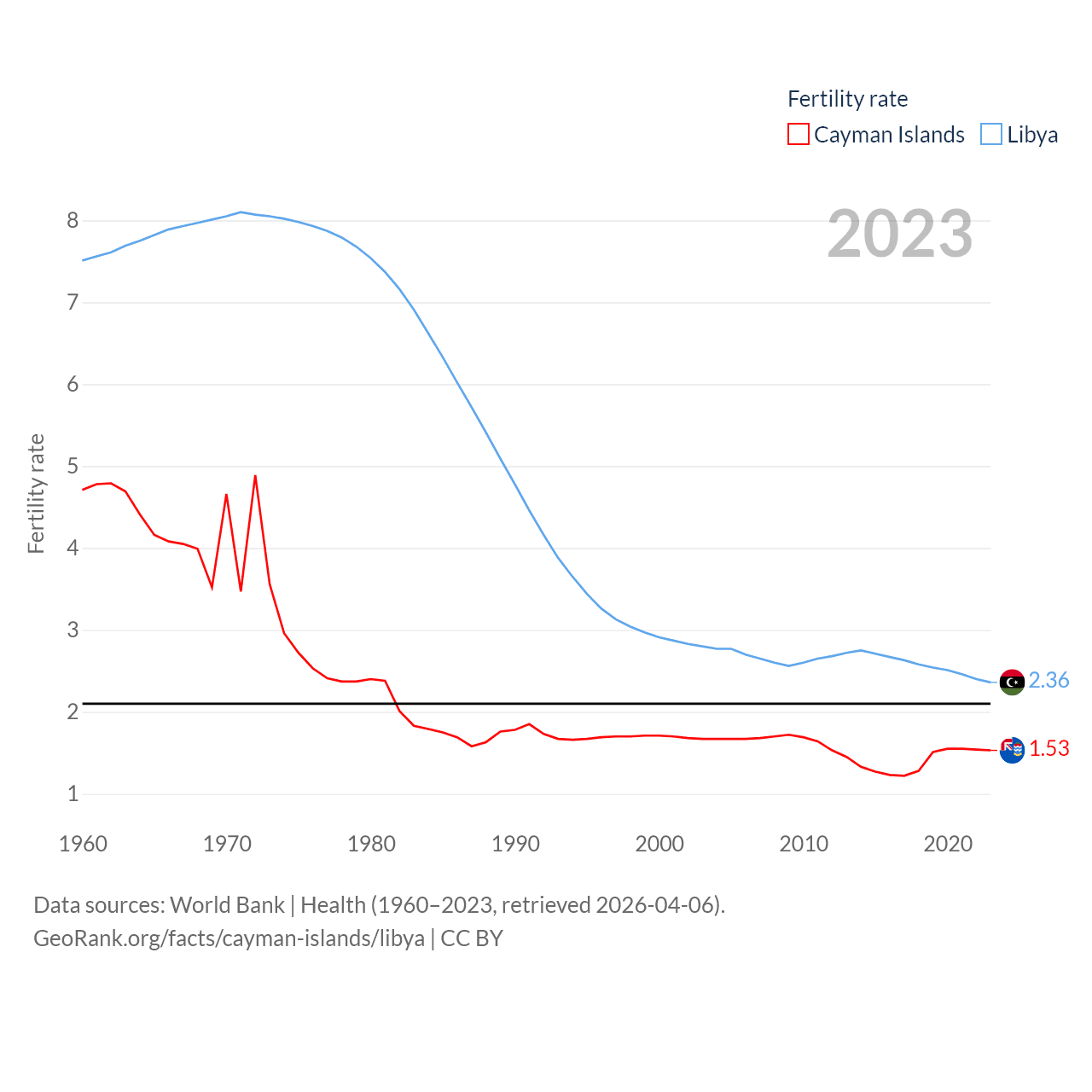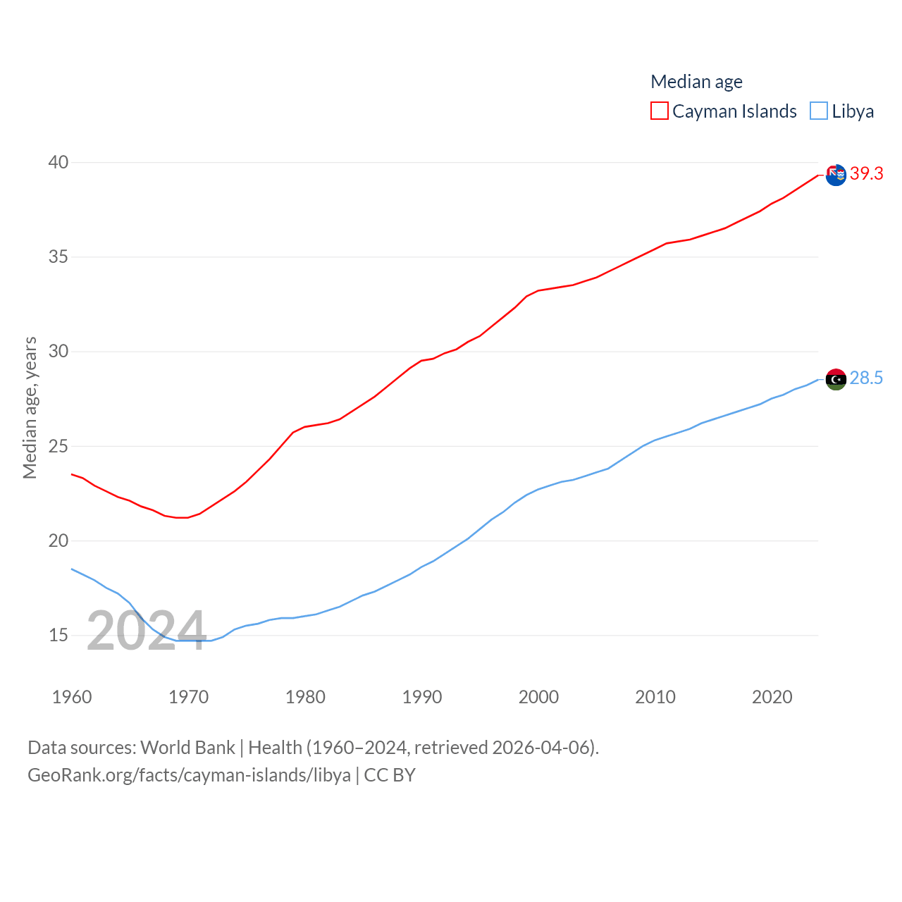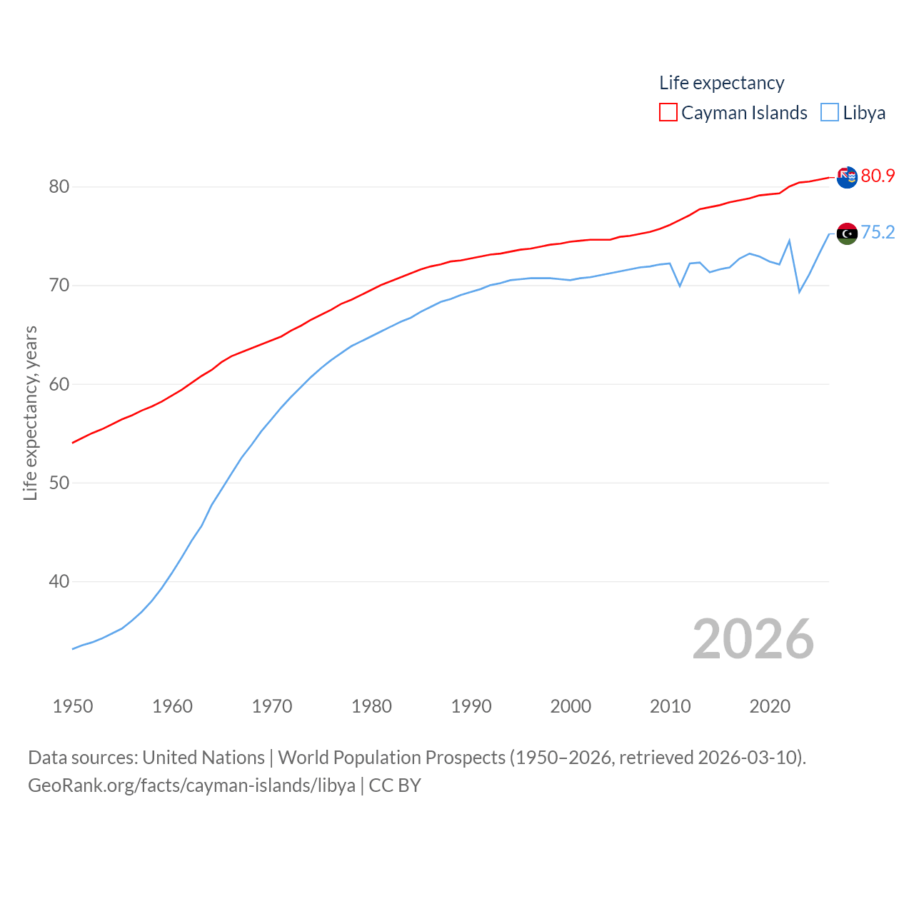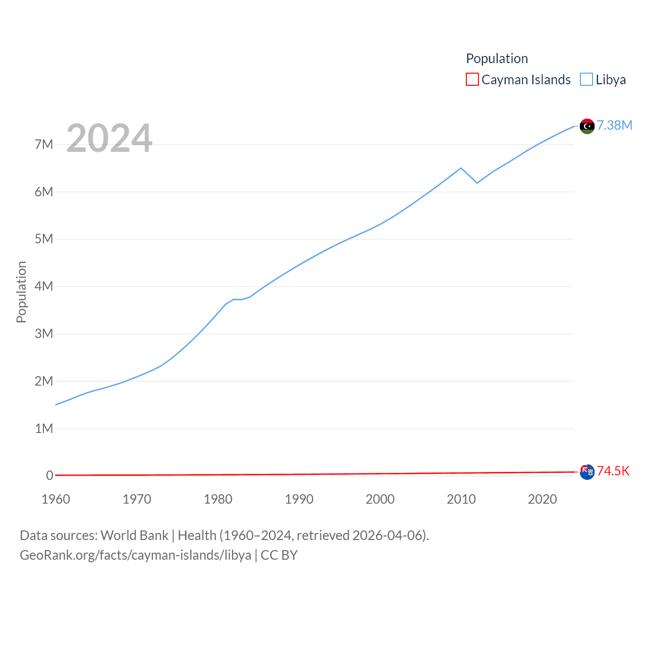 The Cayman Islands has a population of 74.5K (ranked 187/197), compared with 7.38M in Libya (ranked 105/197). The Cayman Islands' land area is 92.7 sq mi versus 679,362 sq mi for Libya (ranked 190th vs. 16th).